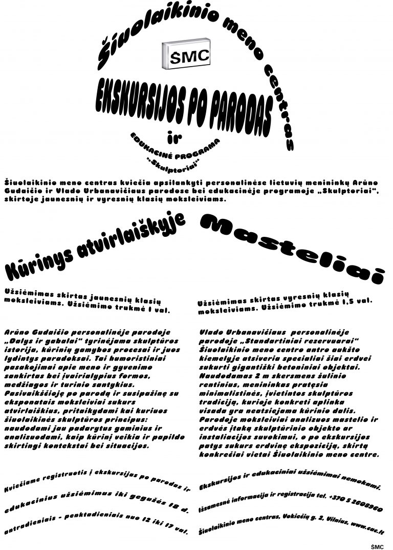 Šiuolaikinio meno centras kviečia apsilankyti personalinėse lietuvių menininkų Arūno Gudaičio ir Vlado Urbanavičiaus parodose bei edukacinėje programoje „Skulptoriai“, skirtoje jaunesnių ir vyresnių klasių moksleiviams.