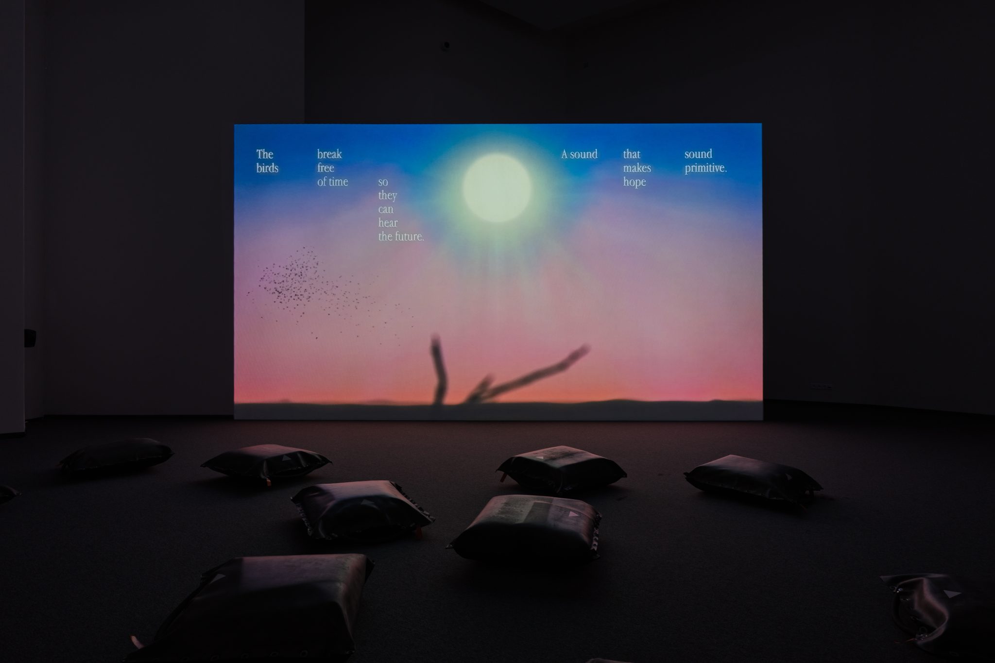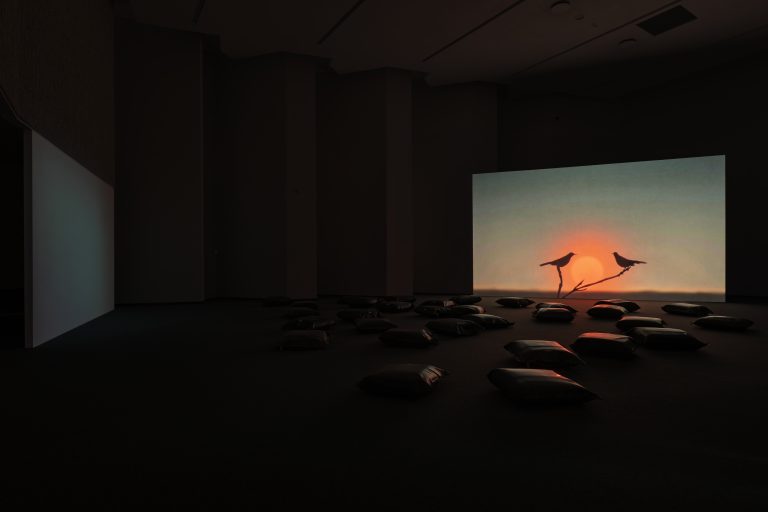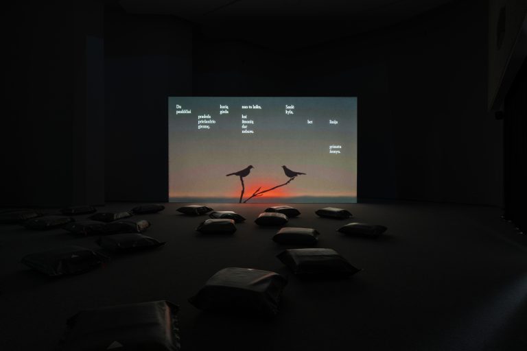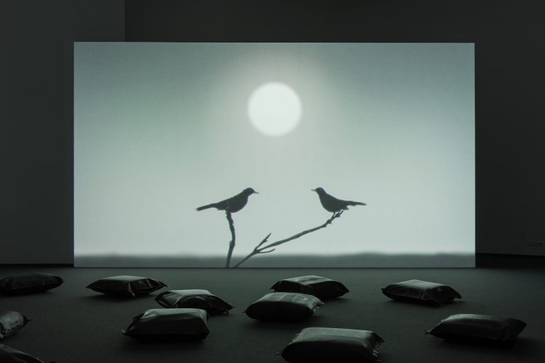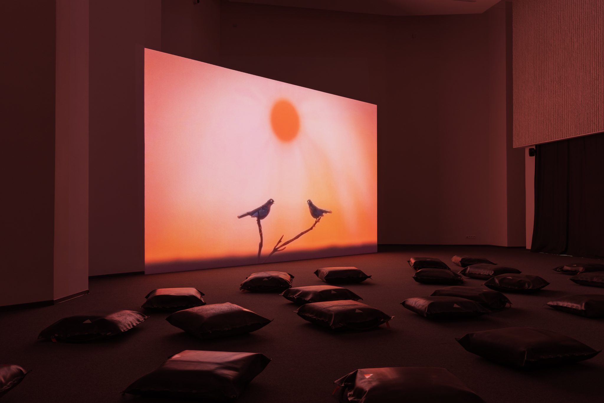 From the depths of the CAC Cinema Hall, the sounds of Anouk De Clercq’s exhibition drift through the bright corridors of the second floor of the Contemporary Art Centre, enveloping visitors in an otherworldly birdsong and inviting them to pause and embrace a world without us. One of the video works in the exhibition depict two birds in a weightless realm, their songs summoning the sun – until an eclipse reveals the stars. Birdsong reflects on beginnings and endings, offering a meditation on a world where humanity no longer exists – a postlapsarian paradise, a kind of love at last sight.