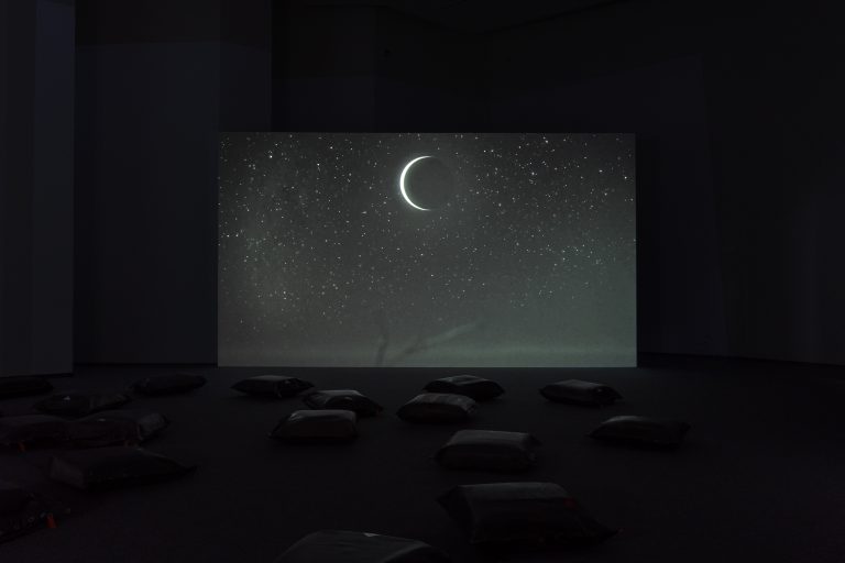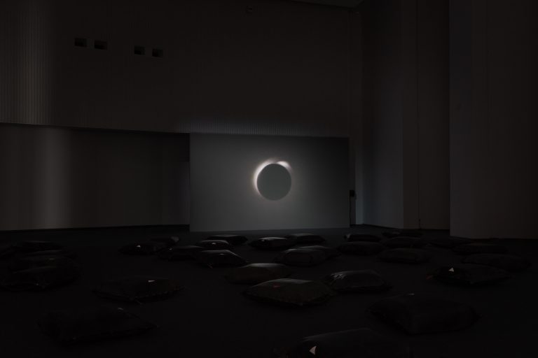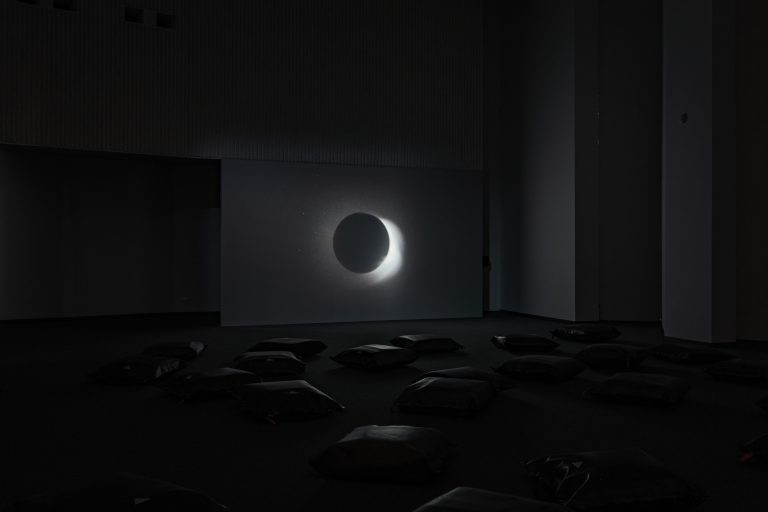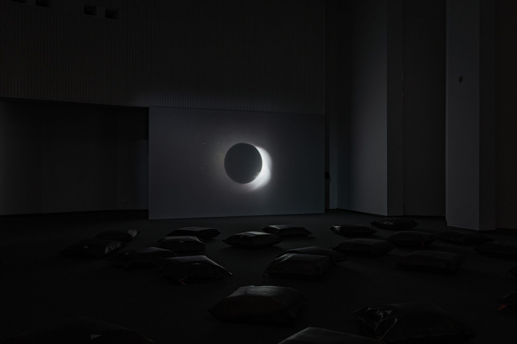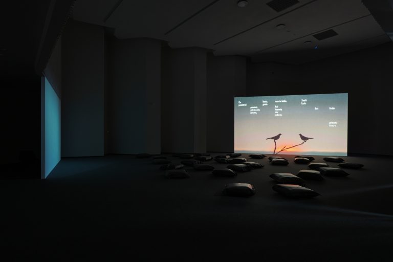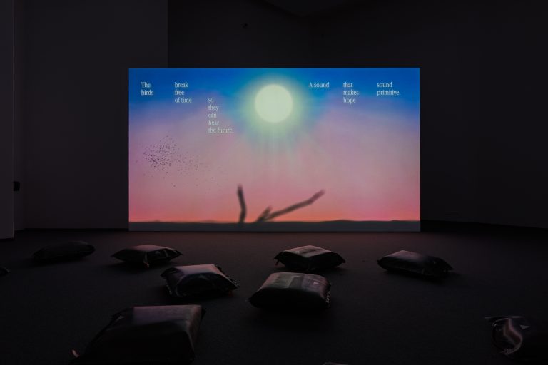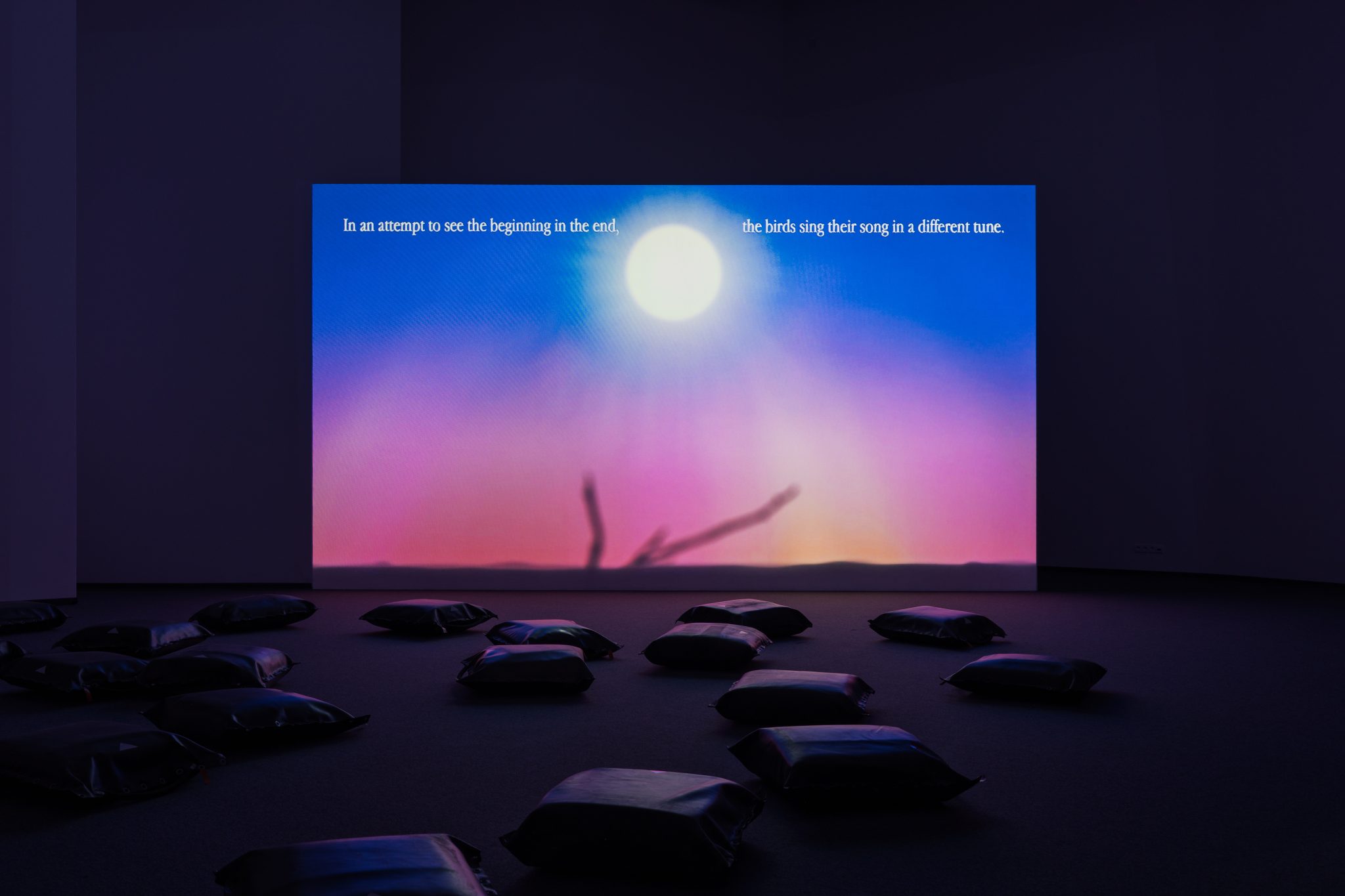 From the depths of the CAC Cinema Hall, the sounds of Anouk De Clercq’s exhibition drift through the bright corridors of the second floor of the Contemporary Art Centre, enveloping visitors in an otherworldly birdsong and inviting them to pause and embrace a world without us. One of the video works in the exhibition depict two birds in a weightless realm, their songs summoning the sun – until an eclipse reveals the stars. Birdsong reflects on beginnings and endings, offering a meditation on a world where humanity no longer exists – a postlapsarian paradise, a kind of love at last sight.
