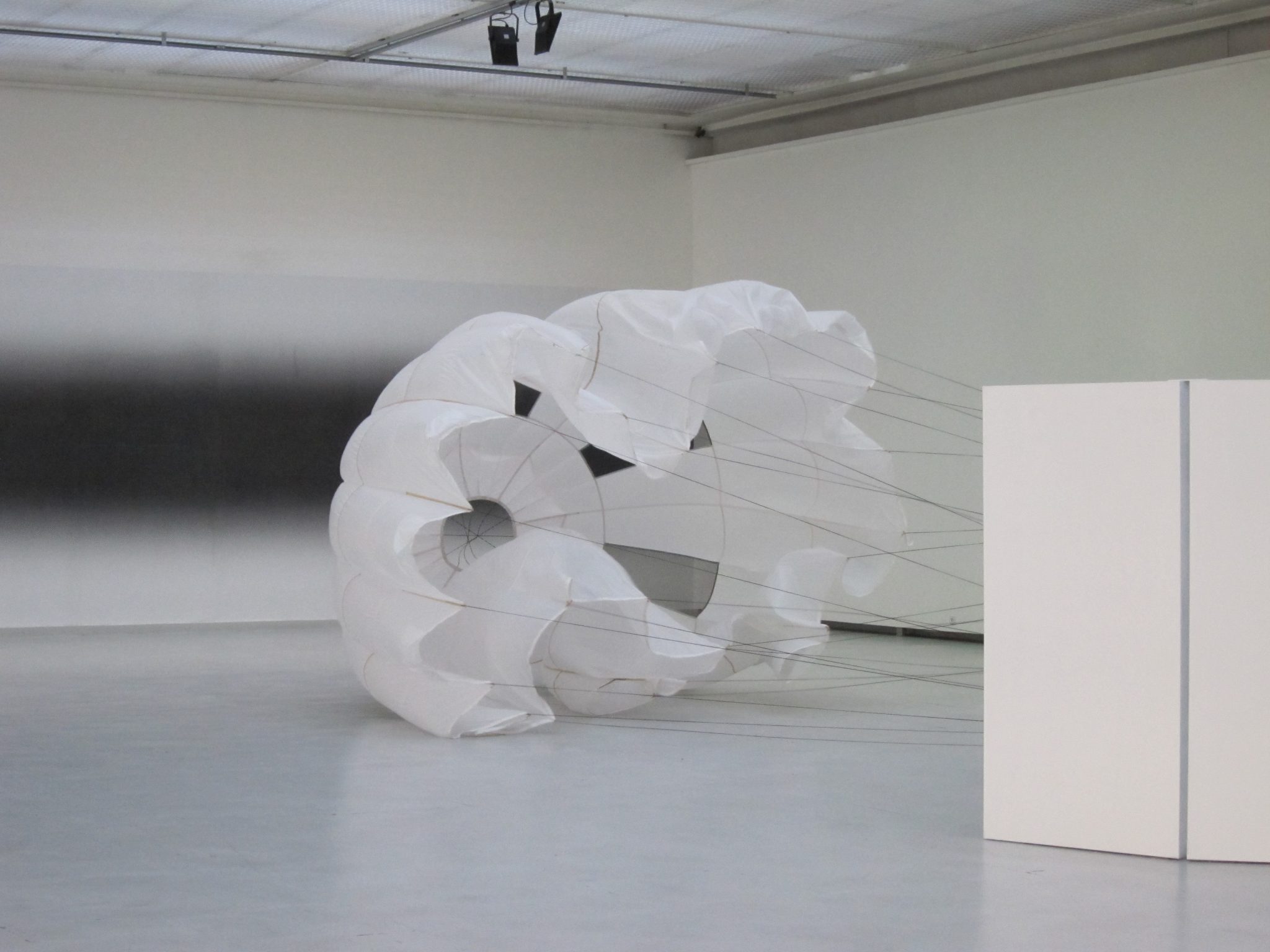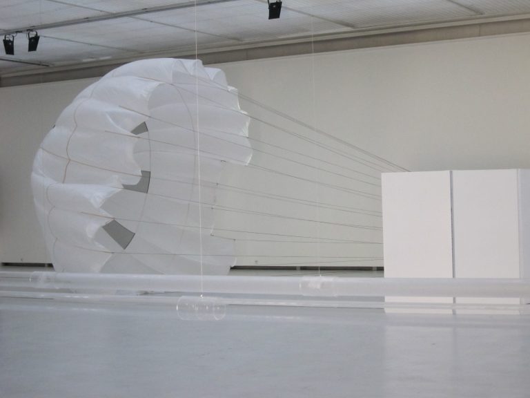 His show Pionier, on display in the Contemporary Art Centre, is titled after one of the exhibited works – an ephemeral installation featuring a huge parachute, presented to the public for the first time. The notion “pioneer” marks the experimental nature of Nicolai’s work – his exhibitions resemble scientific laboratories where various calculations and tests with partly open results are performed.