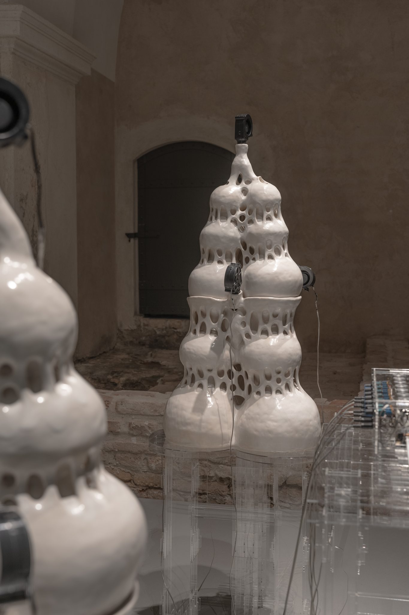 ELENA LAURINAVIČIŪTĖ is an artist from Anykščiai who currently lives and works in Vilnius. In 2024, she completed her Master’s at the Vilnius Academy of Arts. The artist creates experimental ceramic wind instruments. Their sharp edges cut the invisible air and thus transform it into humming and whistling sounds, from which the artist forms three-dimensional soundscapes of air vibrations. Elena explores the relationship between sound and space, actualising the sonic heritage of clay whistles and connecting past and present with ceramic tools.