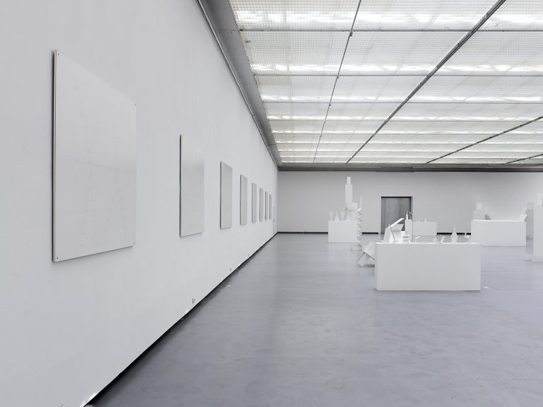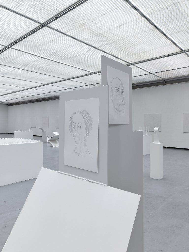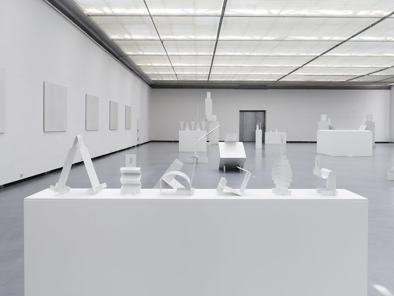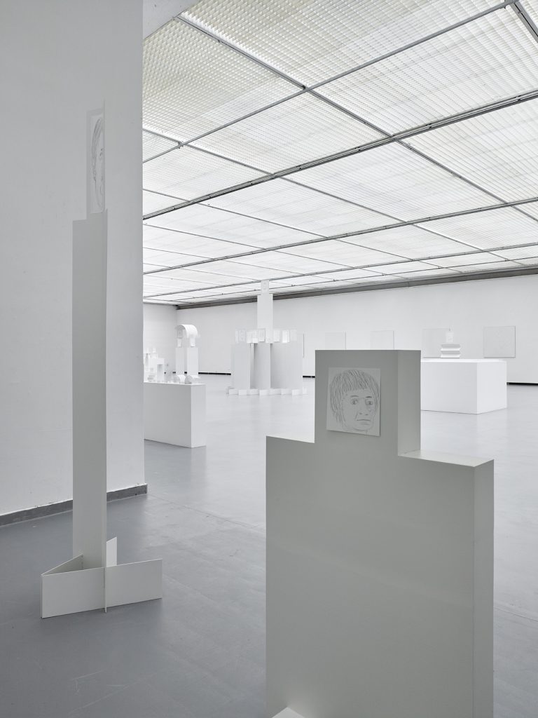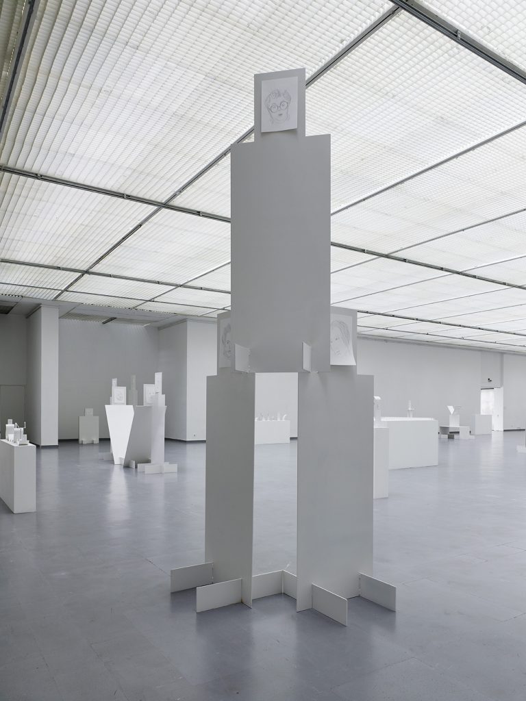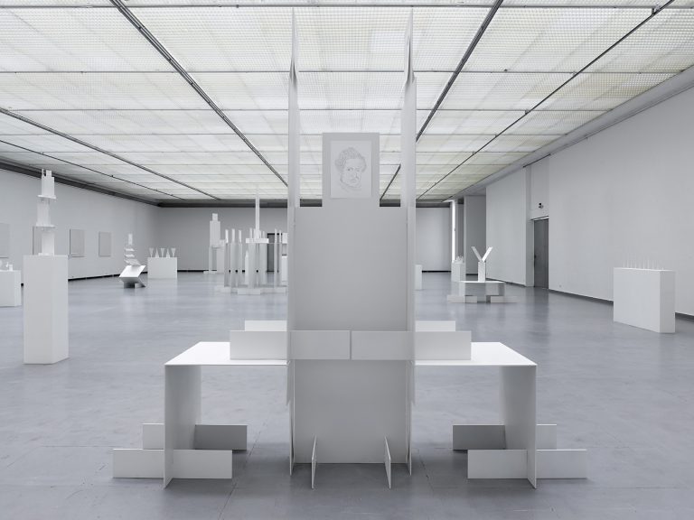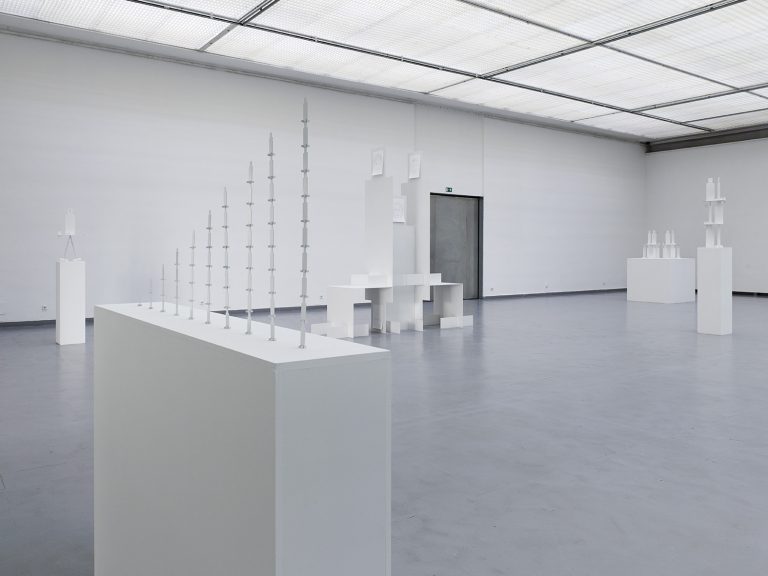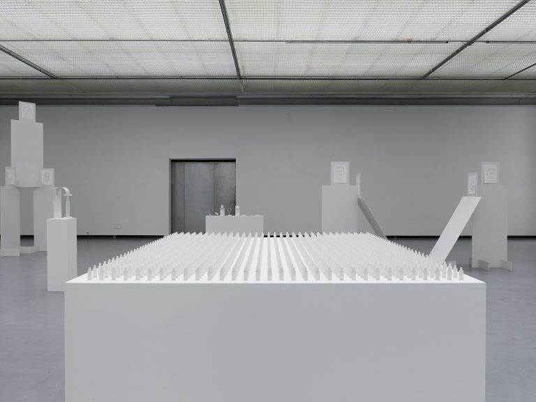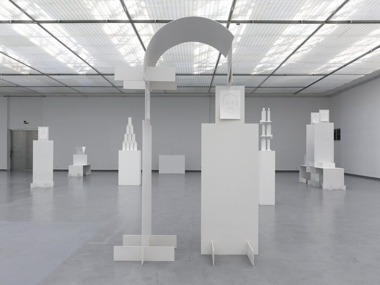 A horizon with thousands of white flat-steel elements—2 mm to 110 mm thick and 6 cm to 240 cm tall, appearing in numerous sizes and variations, all complete with anonymous faces—stretches across the one-thousand-square-metre Great Hall of the Contemporary Art Centre in Vilnius. Standing, seated or kneeling, bent or twisted, on their own or with company, or in monumental stacks of stiff acrobats, the steel elements become the architecture themselves, thus revealing the building’s genesis in 1968. The mass of the elements’ whiteness strips the CAC’s supposedly white hall of its assumed role as a white cube. In the presence of this multitude of anonymous, perfectly uniform elements, the vast, seemingly neutral space is subjected to reveal its dilapidated surfaces and paradigmatic monumentality of the Soviet modernist project. The white figures occupying the hall awkwardly stage their utopian physicality, performing a mass Socialist ritual showcasing their victory against the laws of physics, demonstrating the supremacy of engineered bodies, technologies and souls. The white elements are infantile, dysfunctional and passively aggressive; their multiplicity induces a dry, suffocating mental state of diligent stagnation permeating the everyday, echoing difficult histories of invisible control, past and present, local and global. This is “White Suprematism”, an exhibition by Jos de Gruyter & Harald Thys.
