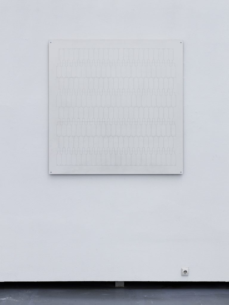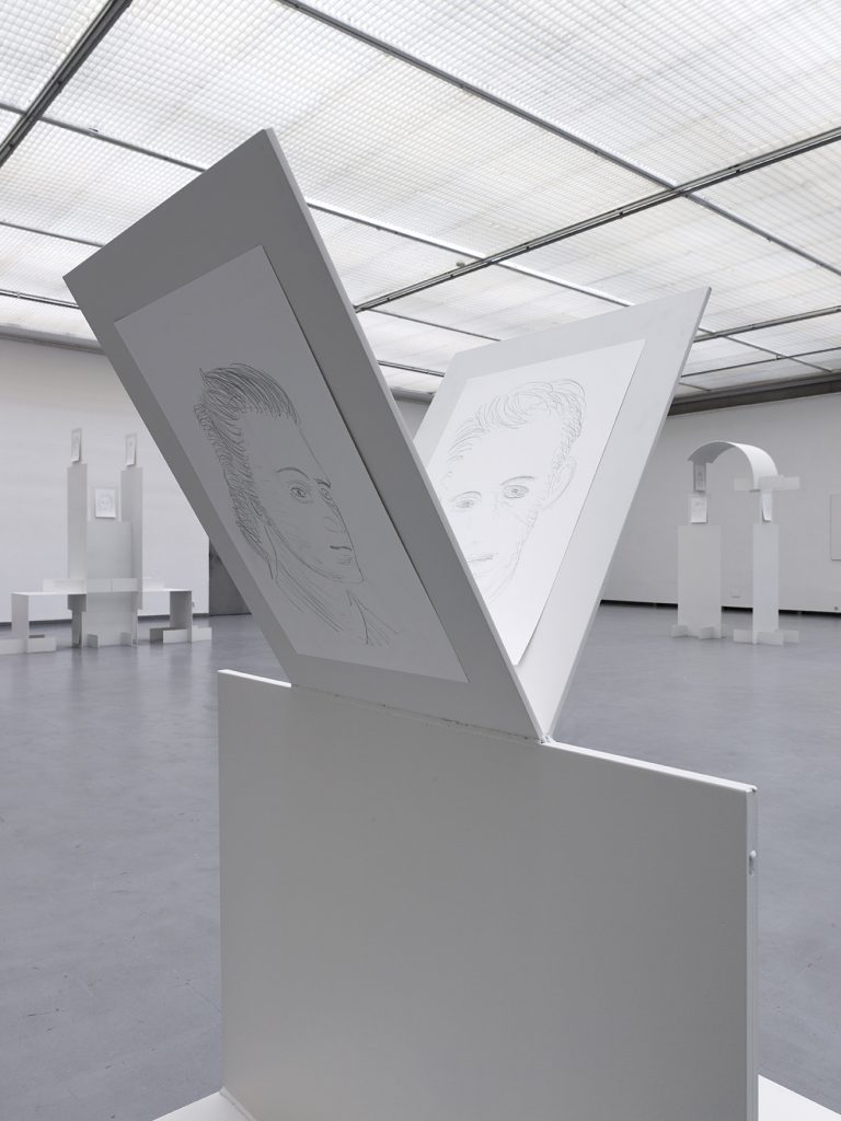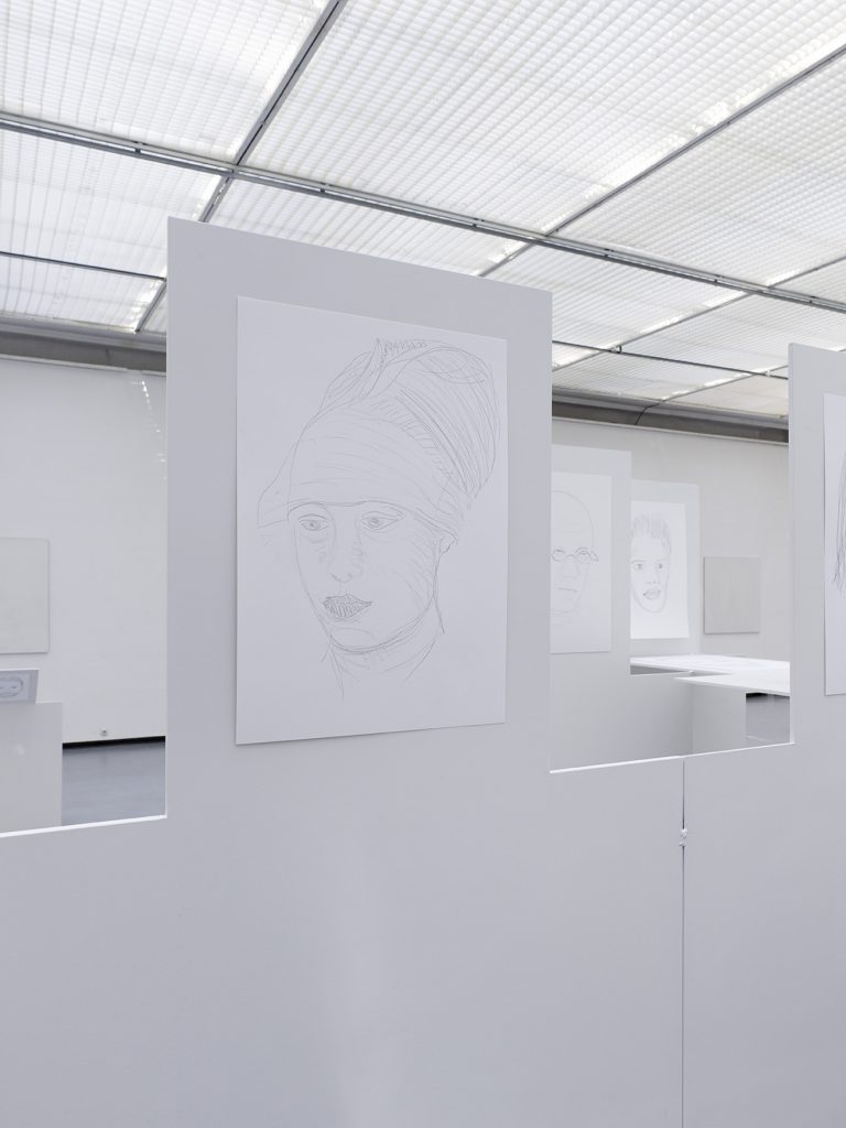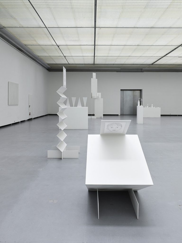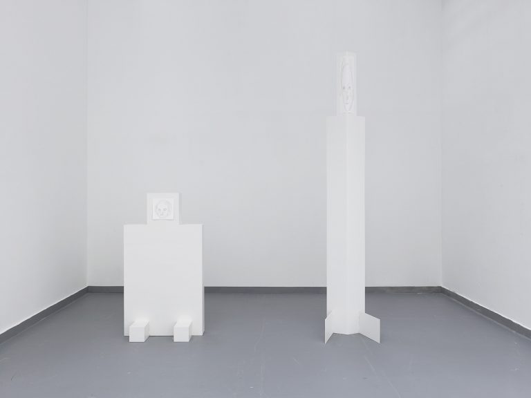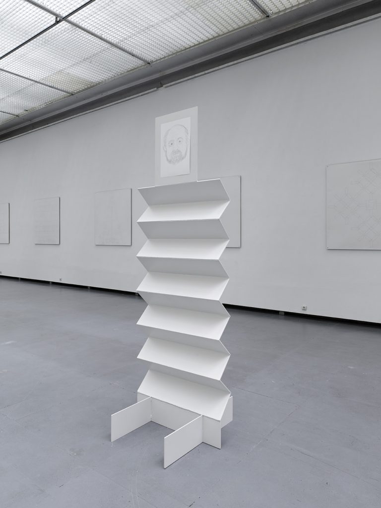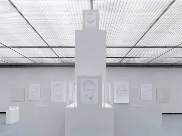 A horizon with thousands of white flat-steel elements—2 mm to 110 mm thick and 6 cm to 240 cm tall, appearing in numerous sizes and variations, all complete with anonymous faces—stretches across the one-thousand-square-metre Great Hall of the Contemporary Art Centre in Vilnius. Standing, seated or kneeling, bent or twisted, on their own or with company, or in monumental stacks of stiff acrobats, the steel elements become the architecture themselves, thus revealing the building’s genesis in 1968. The mass of the elements’ whiteness strips the CAC’s supposedly white hall of its assumed role as a white cube. In the presence of this multitude of anonymous, perfectly uniform elements, the vast, seemingly neutral space is subjected to reveal its dilapidated surfaces and paradigmatic monumentality of the Soviet modernist project. The white figures occupying the hall awkwardly stage their utopian physicality, performing a mass Socialist ritual showcasing their victory against the laws of physics, demonstrating the supremacy of engineered bodies, technologies and souls. The white elements are infantile, dysfunctional and passively aggressive; their multiplicity induces a dry, suffocating mental state of diligent stagnation permeating the everyday, echoing difficult histories of invisible control, past and present, local and global. This is “White Suprematism”, an exhibition by Jos de Gruyter & Harald Thys.