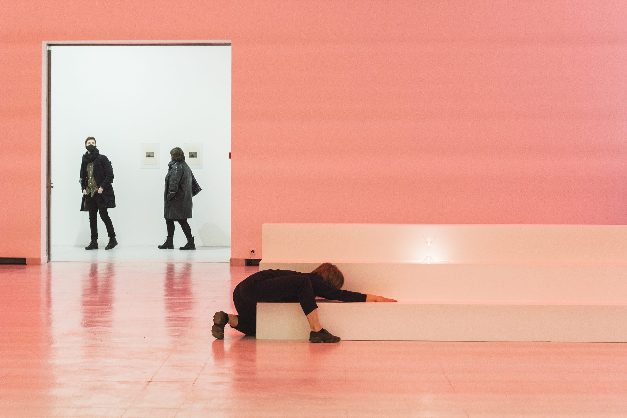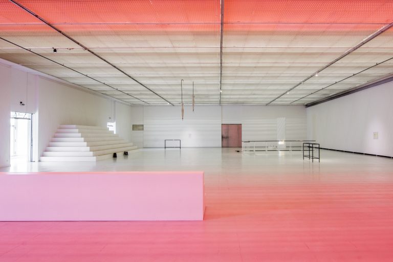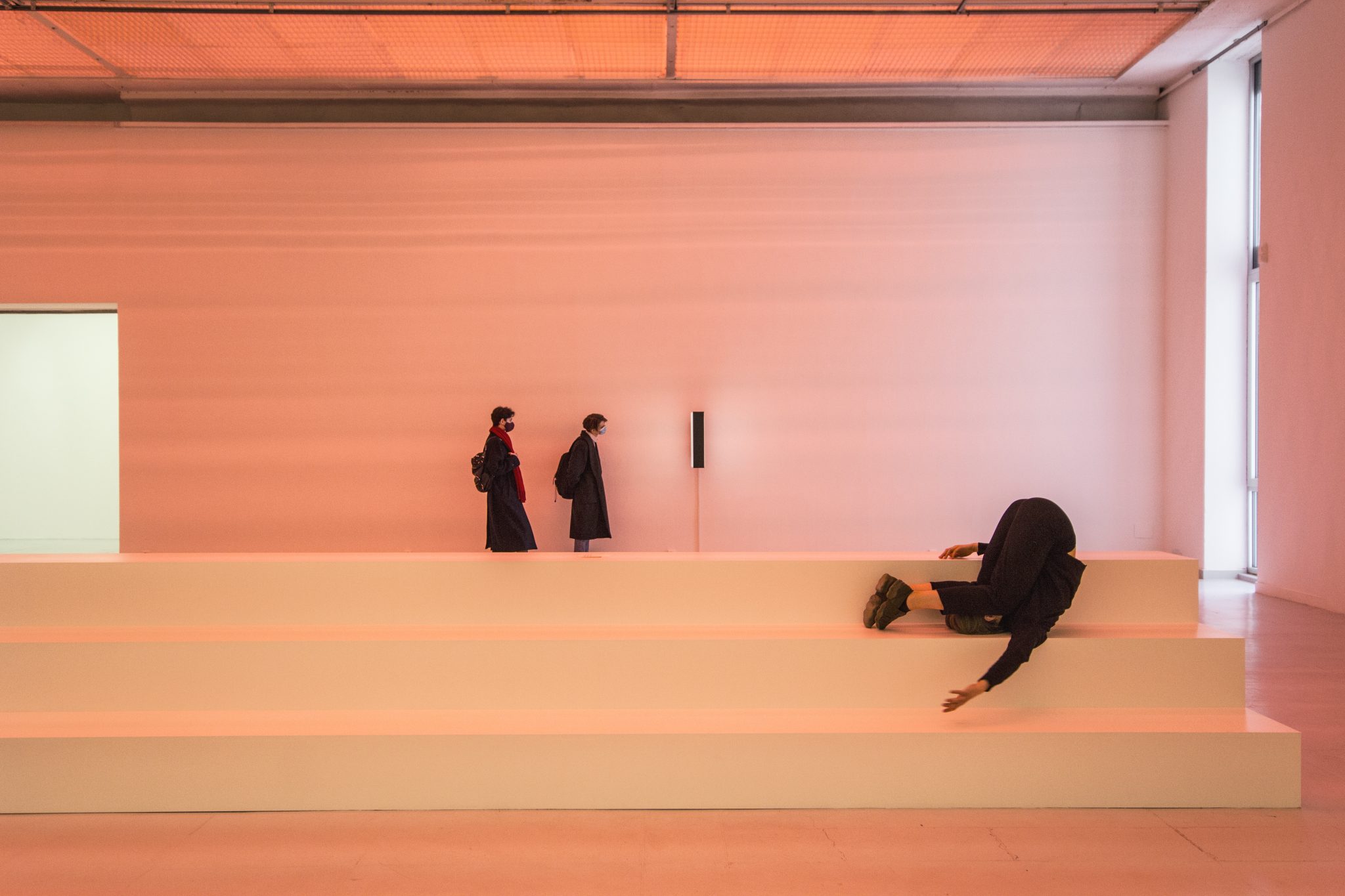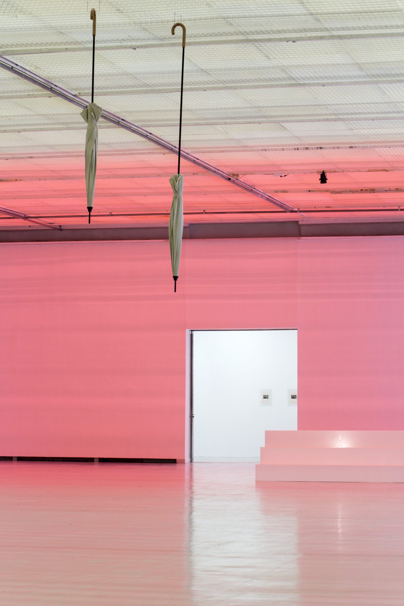 The exhibition echoes a street at both day and night, incorporating modes of presentation from the urban environment and social spaces, as well as large flights of steps that recall lofty locales and civic architecture. Like street mimes, a pair of performers enact subtle movements and activate the exhibition. A portion of the exhibition hall is bathed in a pink light, producing an imaginary colour that is constructed in the mind. Double double is a space for social being that provides volume for conversation to erupt and for the body and mind to wander. One can never be sure what to expect, or if the show will be the same at each repeated visit. You might encounter other curious individuals occupying the exhibition, reflecting, inspecting, investigating, lingering, and perhaps sharing in acts of intimate presentation. Distributed conversations are guaranteed.