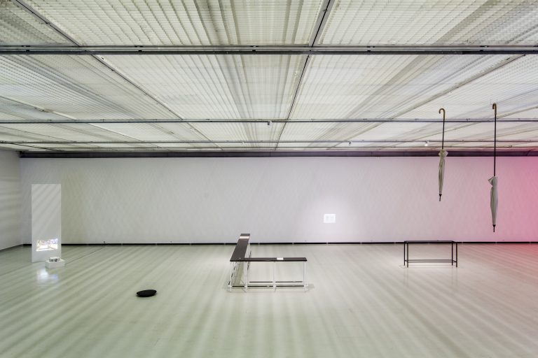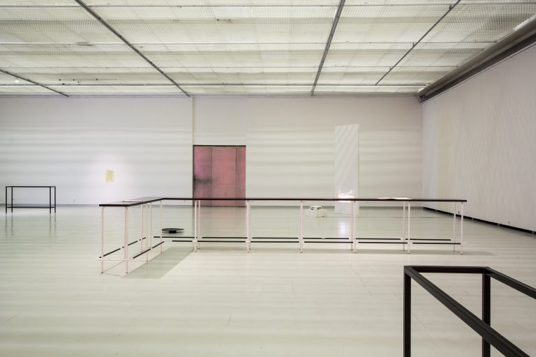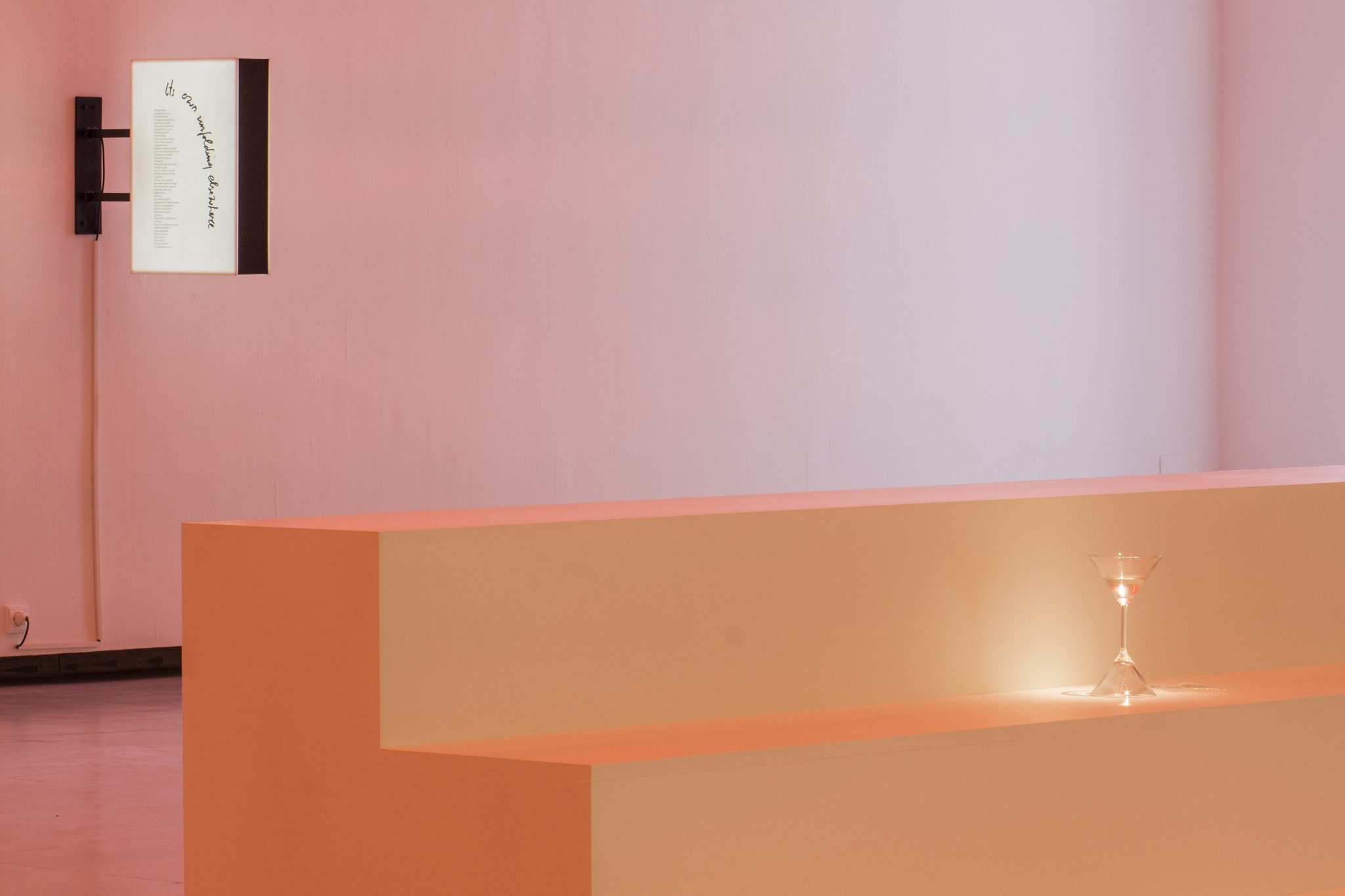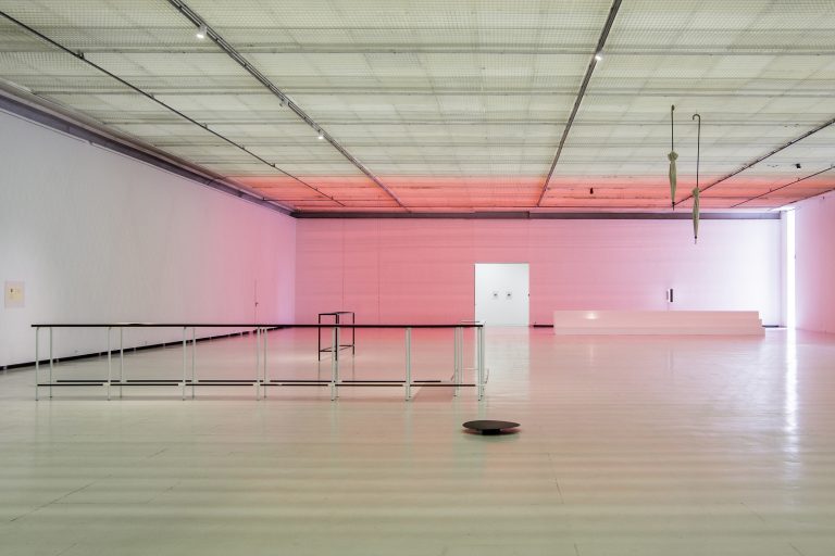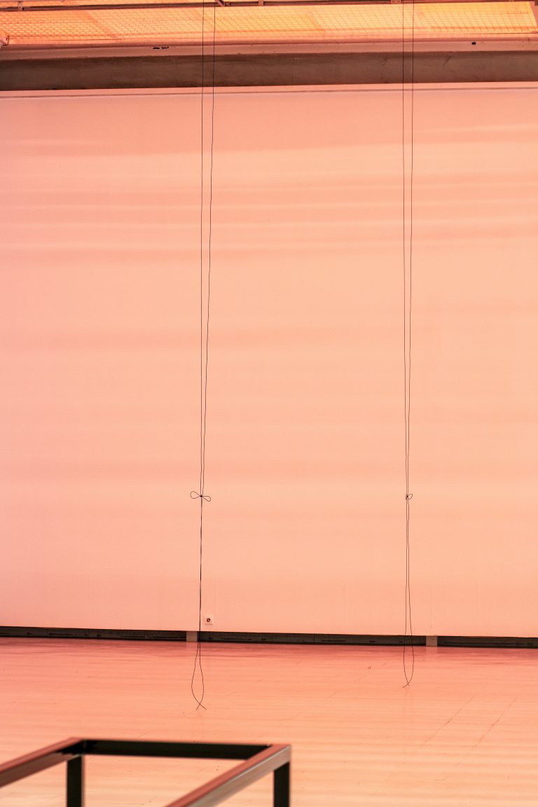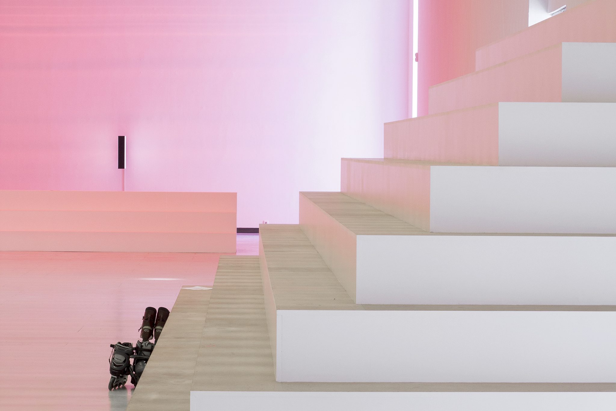 The exhibition echoes a street at both day and night, incorporating modes of presentation from the urban environment and social spaces, as well as large flights of steps that recall lofty locales and civic architecture. Like street mimes, a pair of performers enact subtle movements and activate the exhibition. A portion of the exhibition hall is bathed in a pink light, producing an imaginary colour that is constructed in the mind. Double double is a space for social being that provides volume for conversation to erupt and for the body and mind to wander. One can never be sure what to expect, or if the show will be the same at each repeated visit. You might encounter other curious individuals occupying the exhibition, reflecting, inspecting, investigating, lingering, and perhaps sharing in acts of intimate presentation. Distributed conversations are guaranteed.