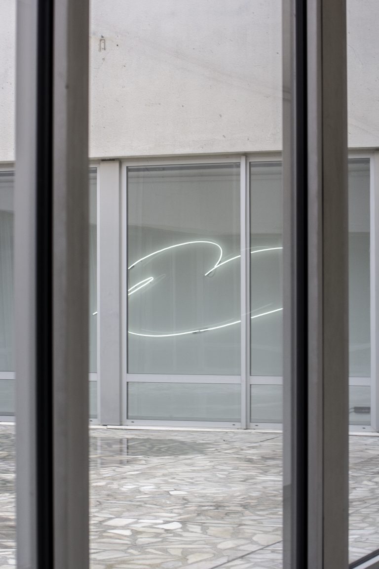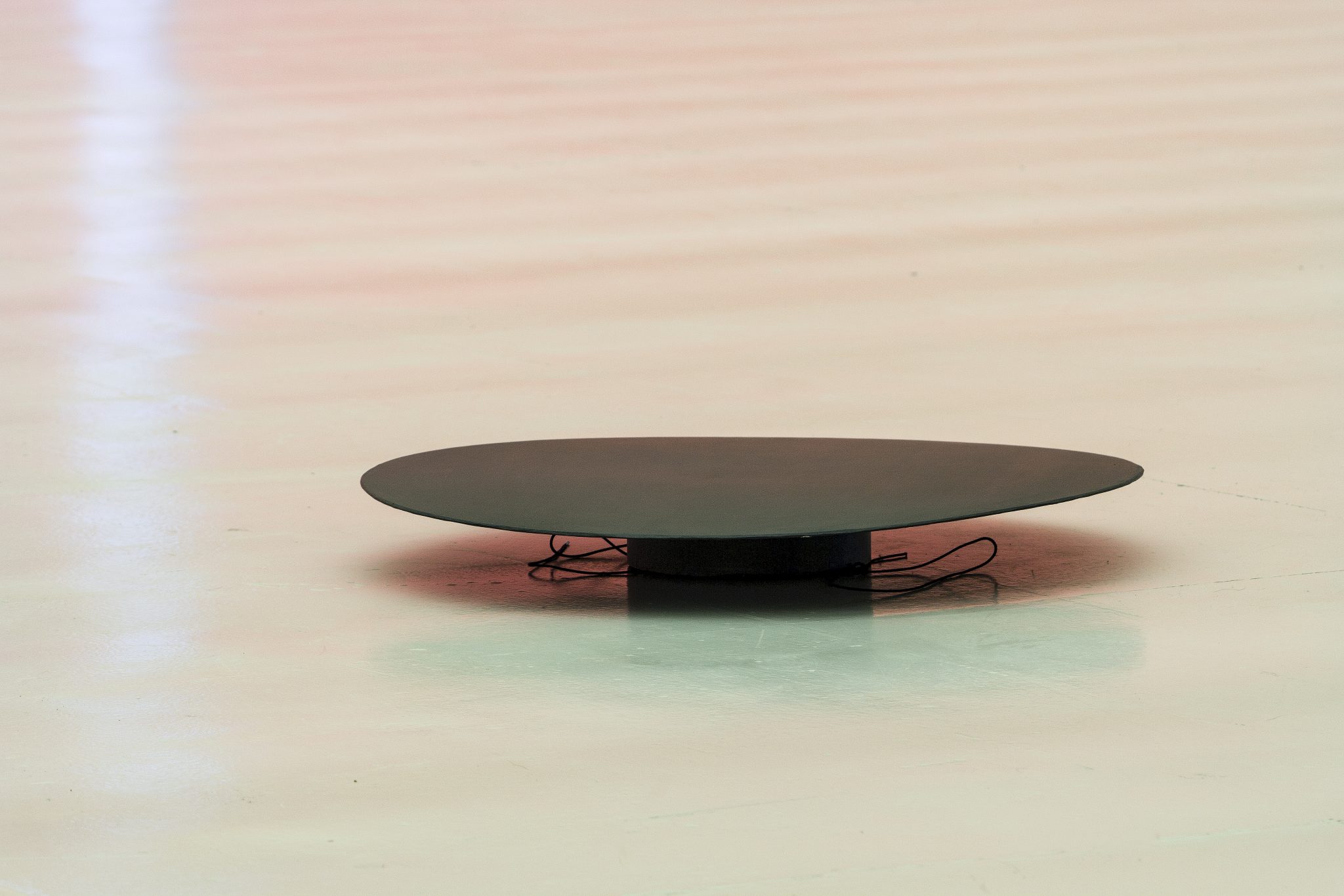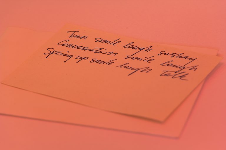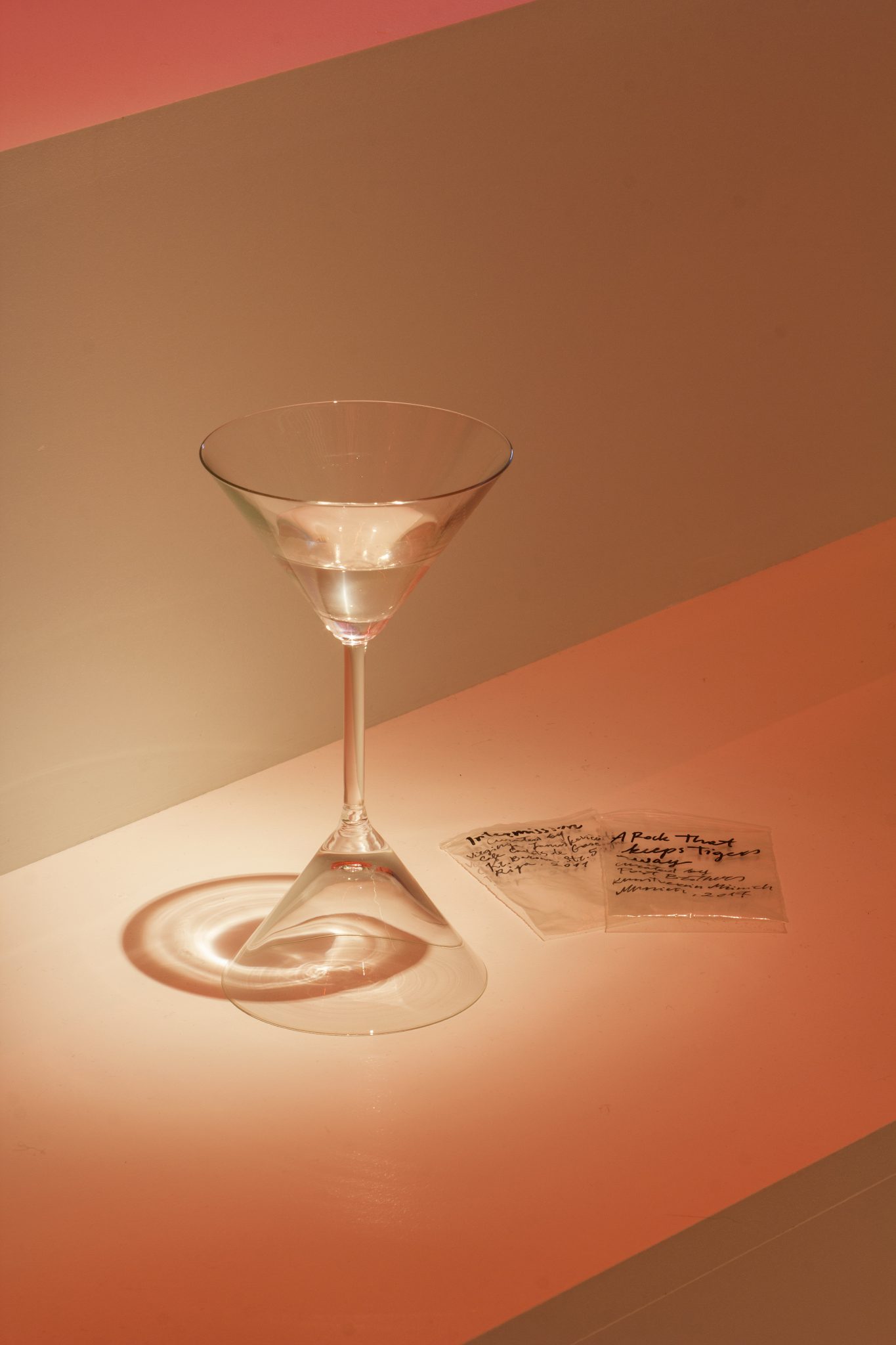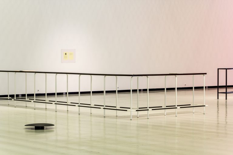 The exhibition echoes a street at both day and night, incorporating modes of presentation from the urban environment and social spaces, as well as large flights of steps that recall lofty locales and civic architecture. Like street mimes, a pair of performers enact subtle movements and activate the exhibition. A portion of the exhibition hall is bathed in a pink light, producing an imaginary colour that is constructed in the mind. Double double is a space for social being that provides volume for conversation to erupt and for the body and mind to wander. One can never be sure what to expect, or if the show will be the same at each repeated visit. You might encounter other curious individuals occupying the exhibition, reflecting, inspecting, investigating, lingering, and perhaps sharing in acts of intimate presentation. Distributed conversations are guaranteed.