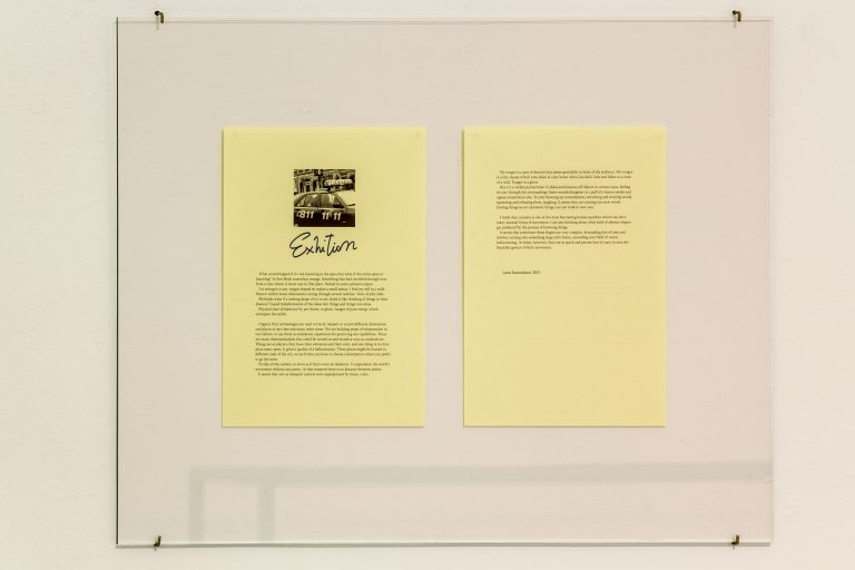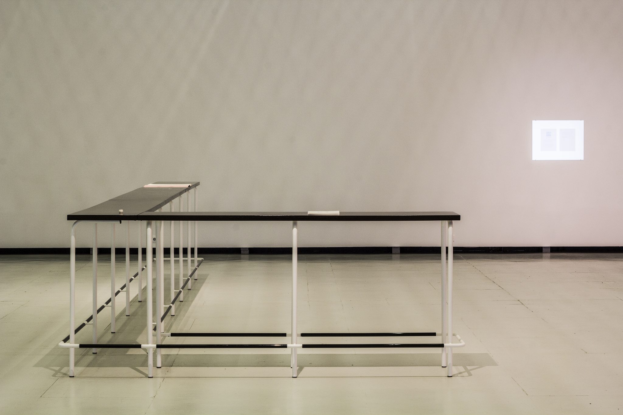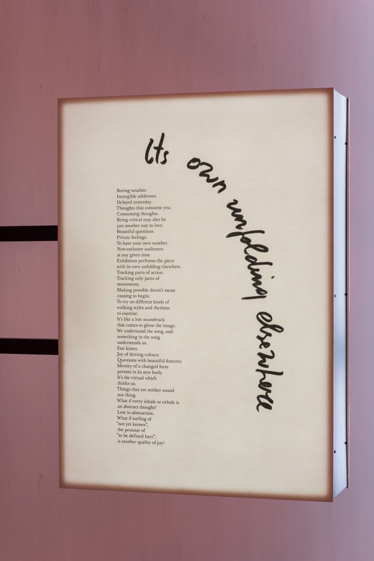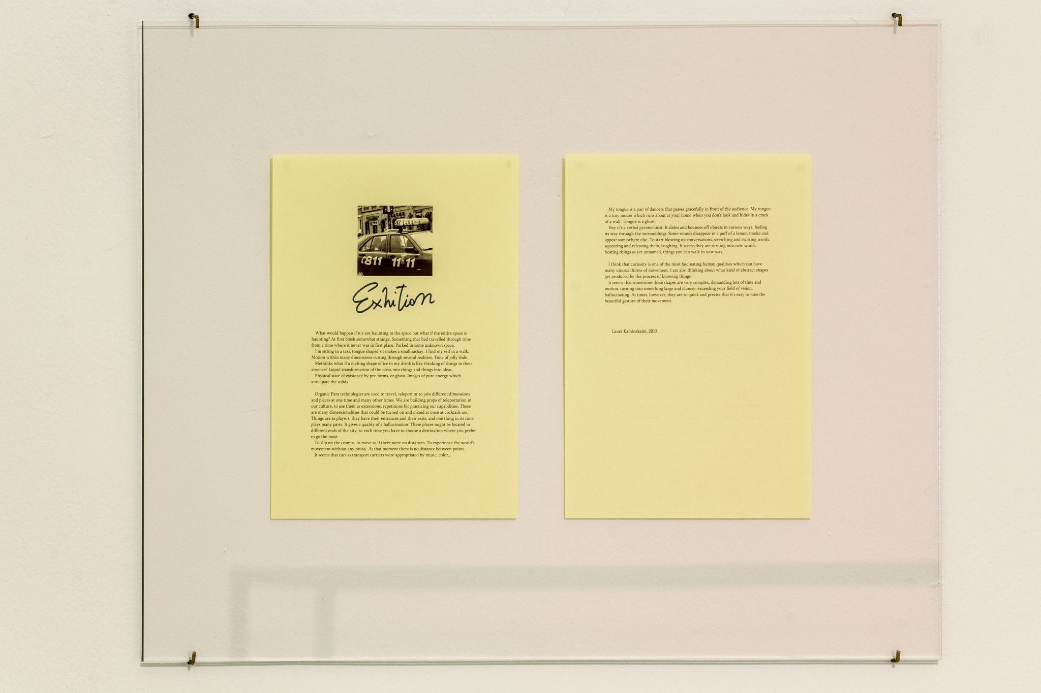 It considers the exhibition format itself as a technology. A routine for the display and apprehension of information, exhibitions are always in a reciprocal relationship with the objects, ideas, bodies, and interactions within it. Artworks double the logics of their means of display, and exhibitions overlap and double the artworks in turn. This interplay induces a certain style of movement and awareness, a tempo that connects physical to mental shifts. You bring your day into the exhibition and leave carrying its rhythms and logics back out into the world. Sometimes the work only appears later on, and then reverberates in your mind and emerges at unexpected moments along your subsequent journeys. Double double tests how this promise and awareness changes the shape of our activities and relationships, generating a succession of double takes by addressing the exhibition as peculiar system that contains and refracts the everyday.