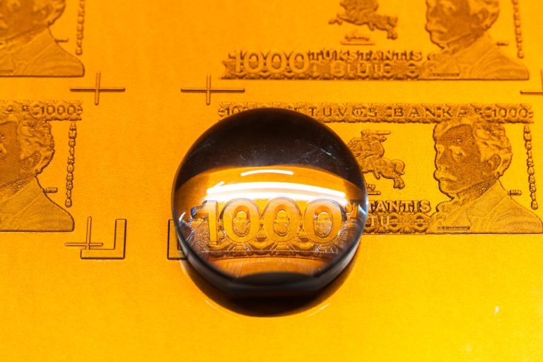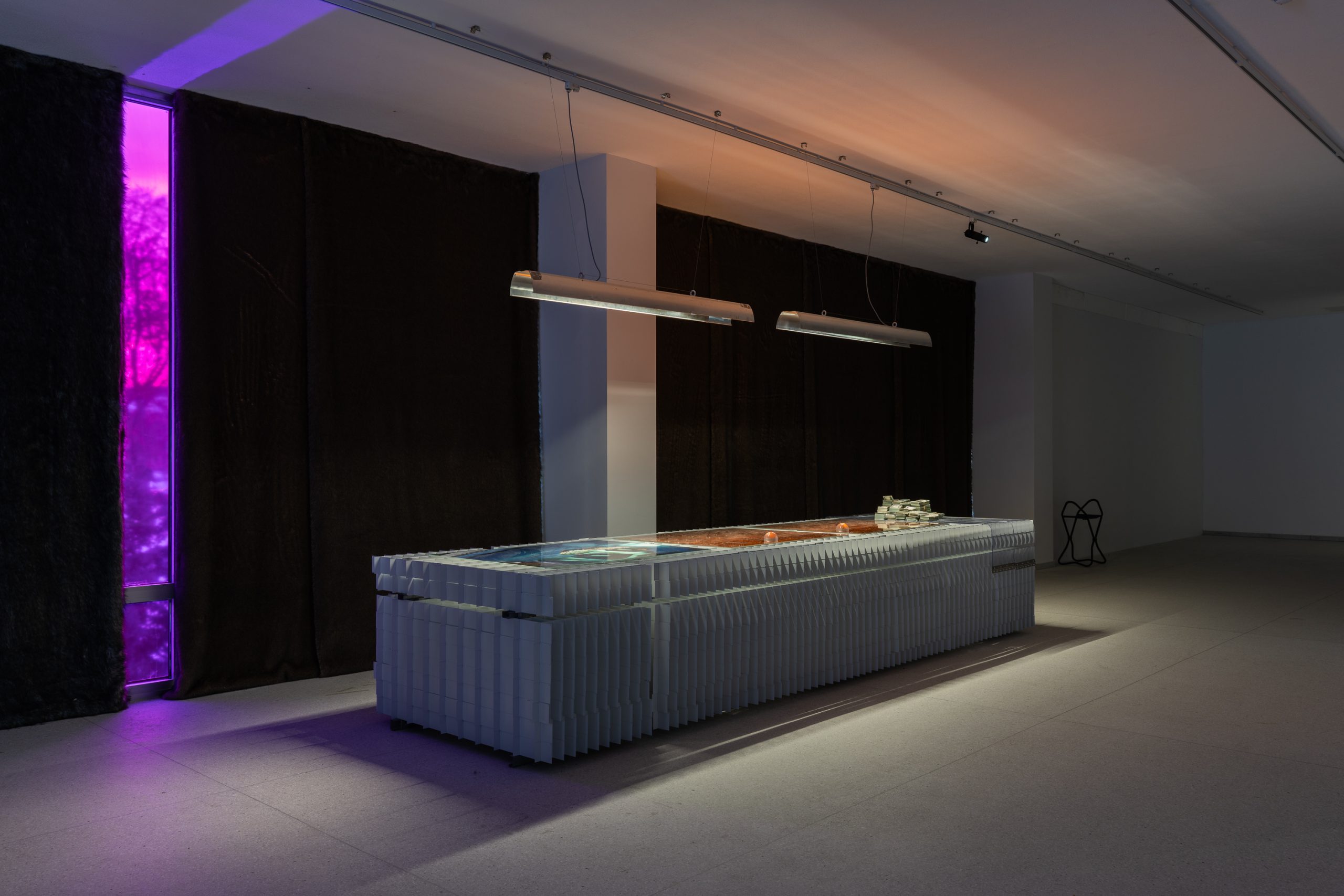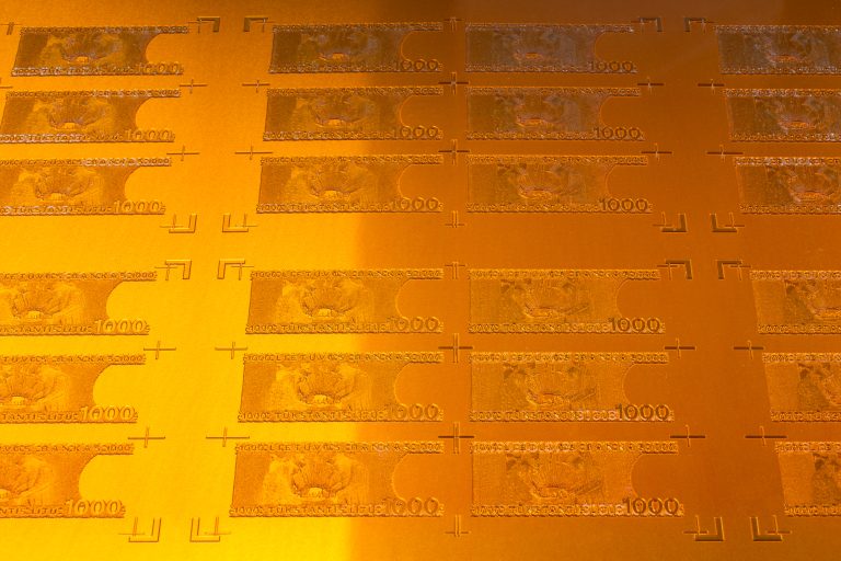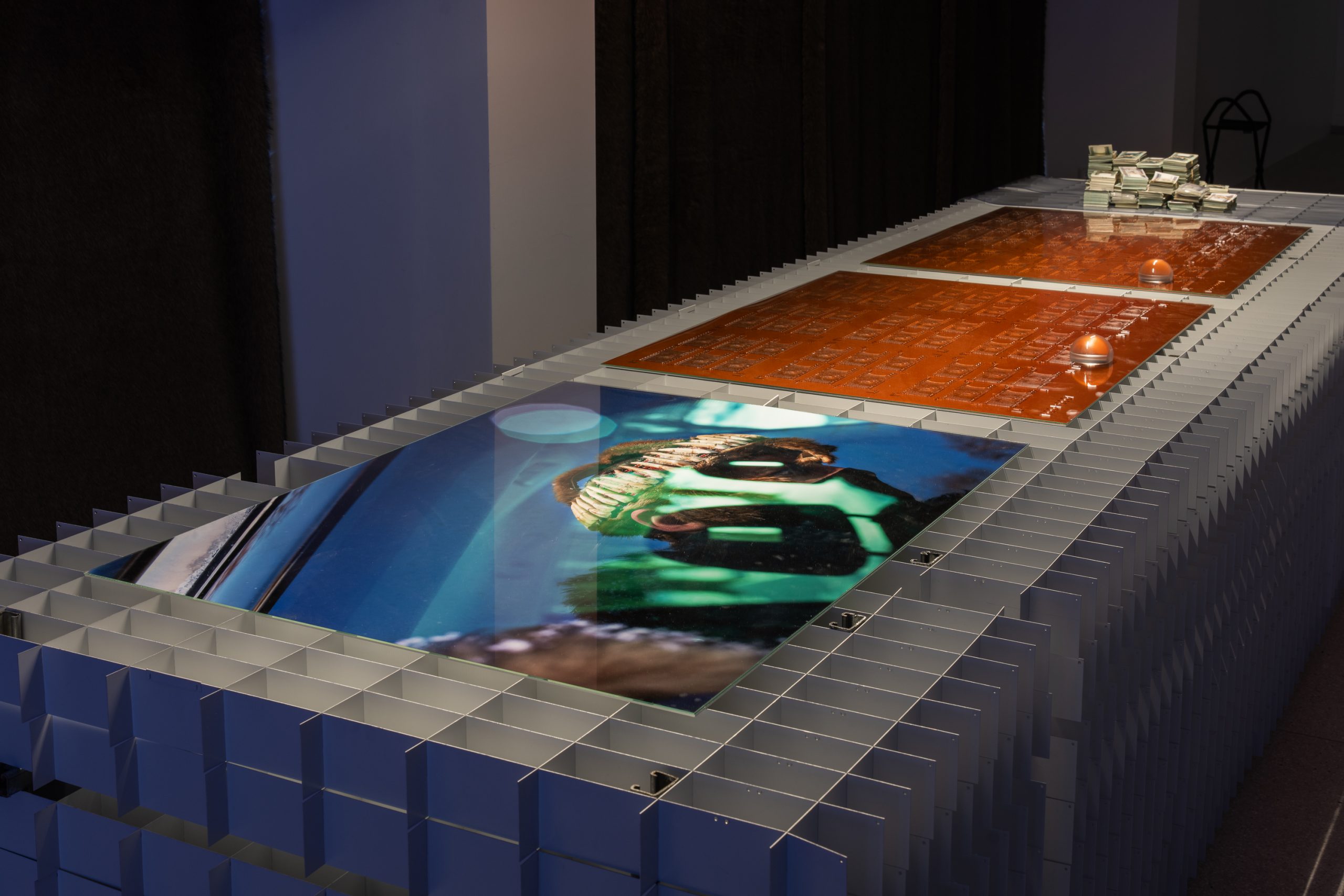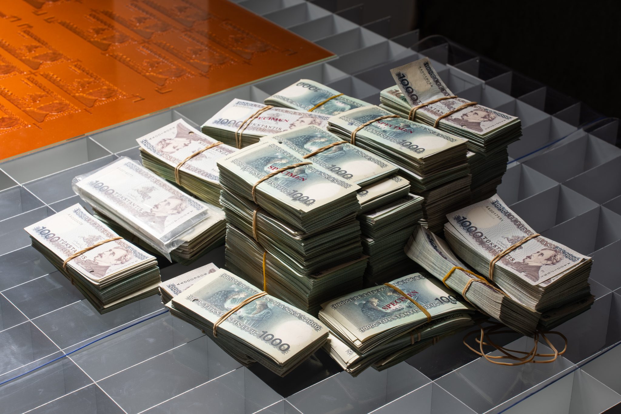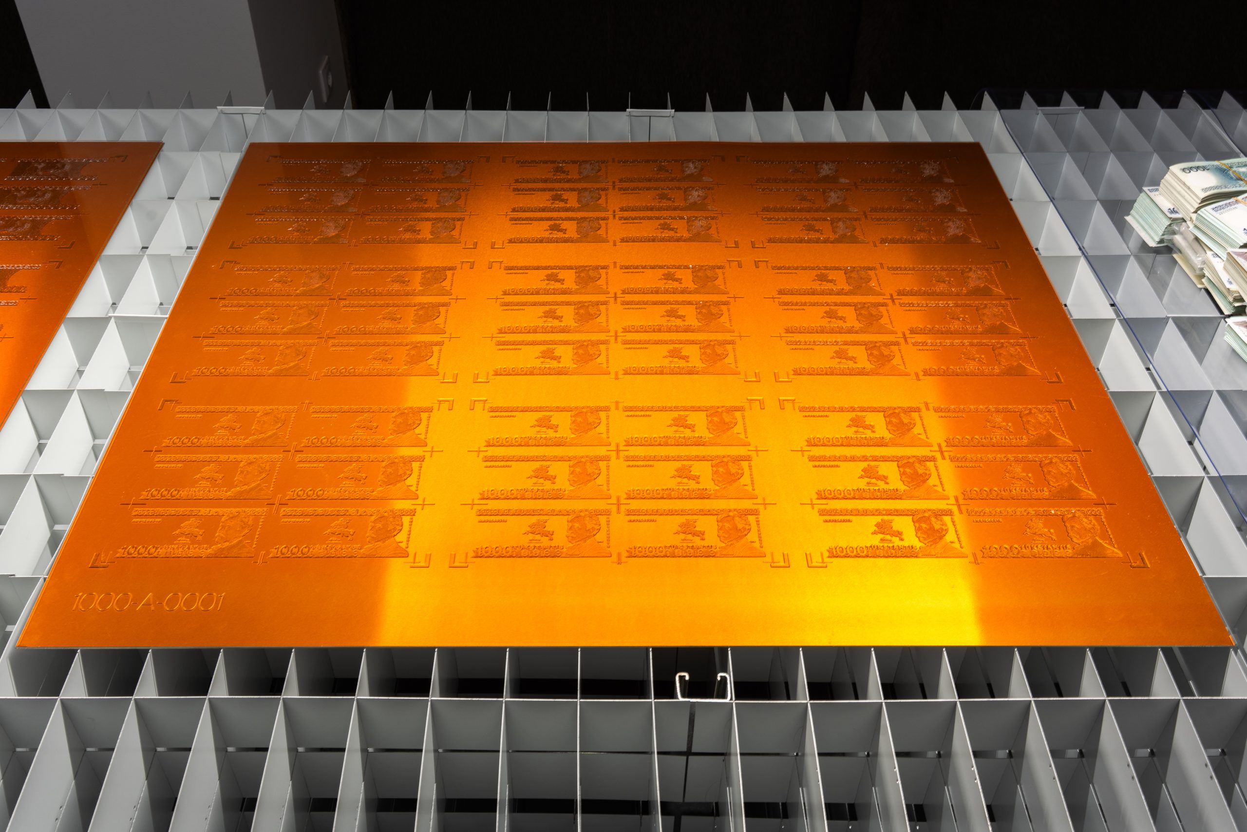 Mykolas Valantinas, 1K (Deconstructed Thousand), 2026. Photopolymer printing plates, ECO3 Arziro Design+ security software, 3.5 million Lithuanian litas in 1000 LTL banknotes (1991, first edition), glass, table display. Photo (detail) by Andrej Vasilenko