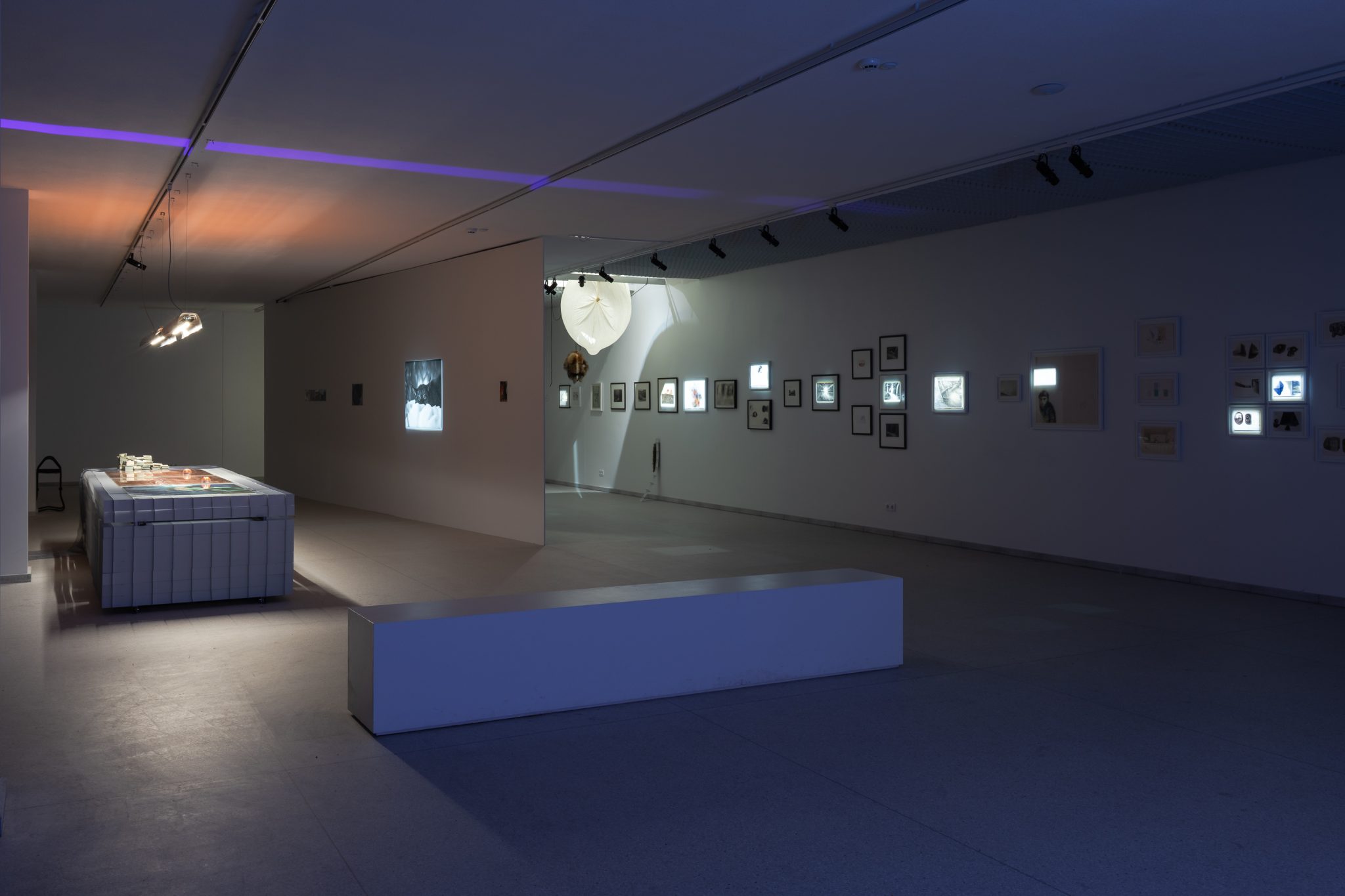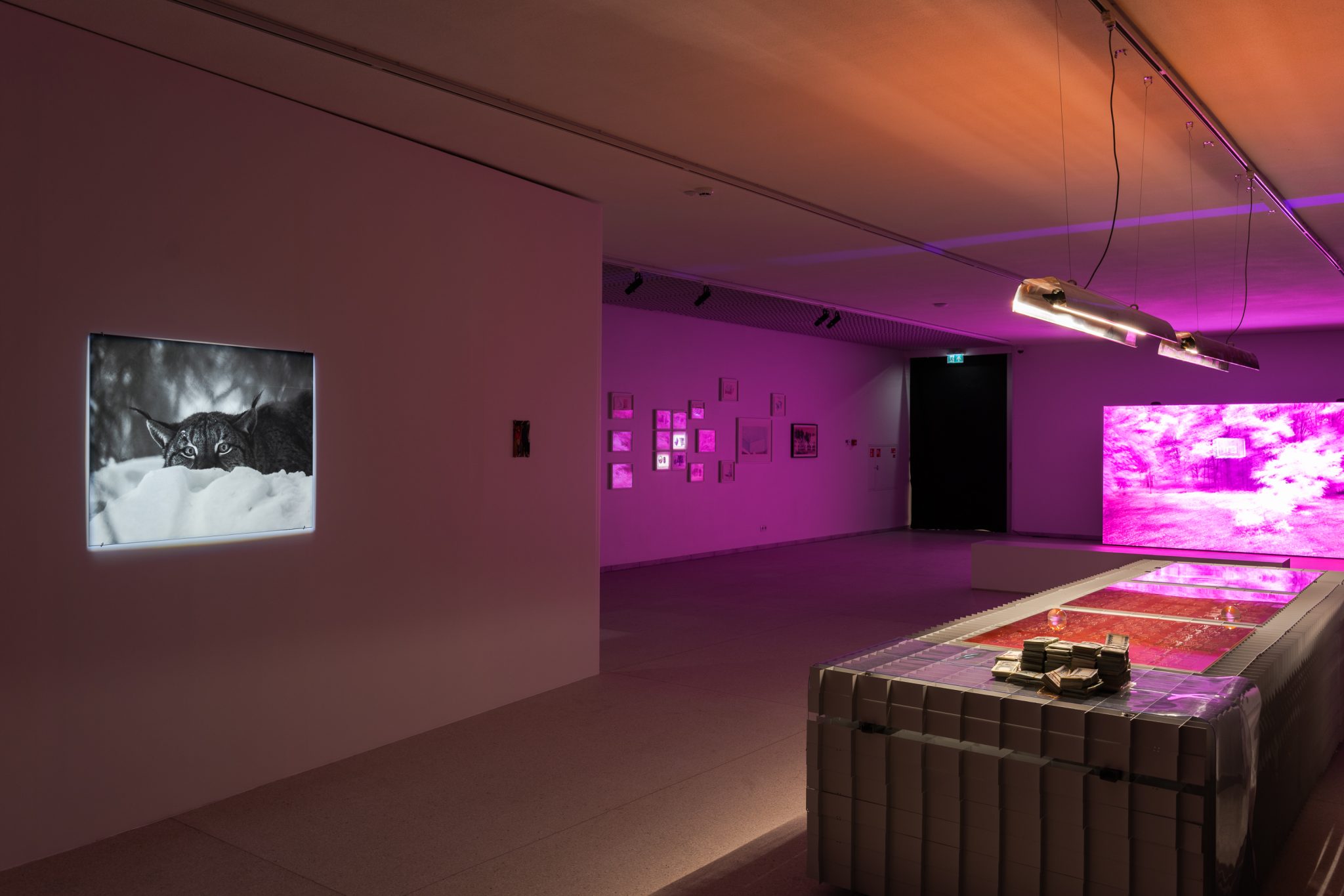 Mykolas Valantinas, 1K (Deconstructed Thousand), 2025. Photopolymer and offset printing plates, screen-printing frames with watermark and UV protection features, ECO3 Arziro Design+ security software, glass, table display. Photo by Lukas Mykolaitis