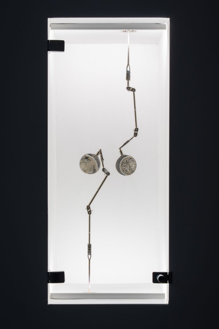 Rytis Valantinas and Mykolas Valantinas, design proposal for the collectors’ coin Aitvaras, 2025. Silver, glass display with magnifying lens, coin dies. Photo (detail) by Lukas Mykolaitis