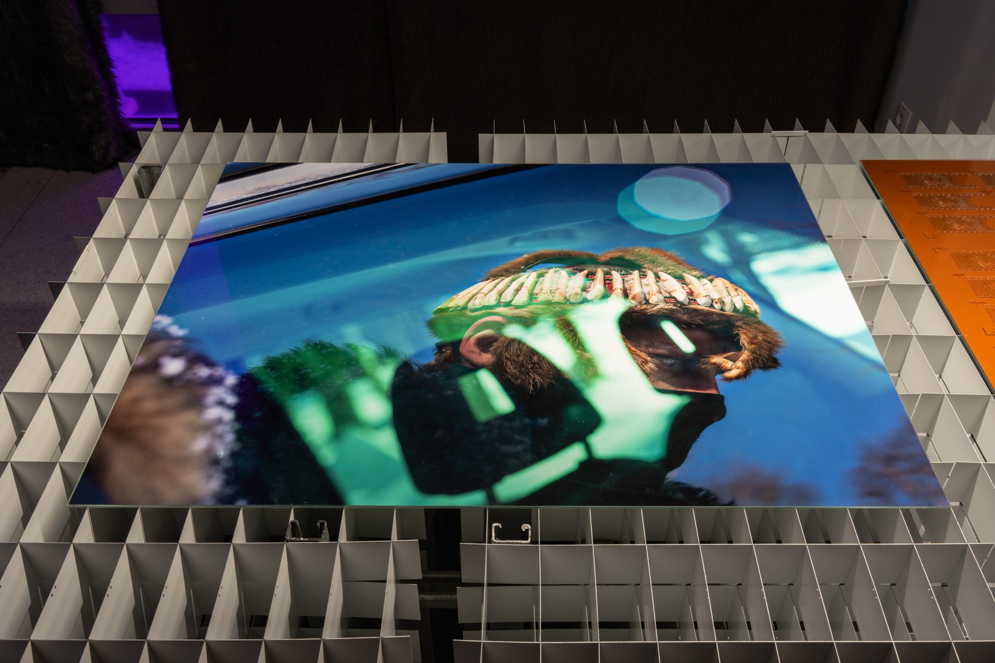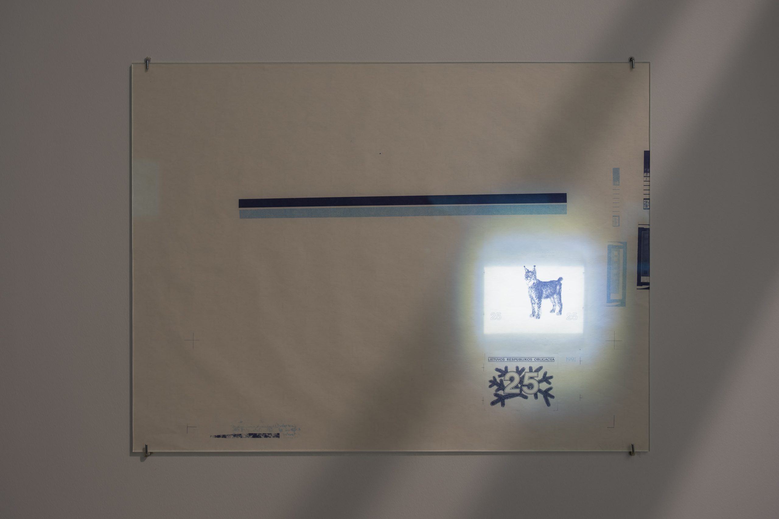 Mykolas Valantinas, 1K (Deconstructed Thousand), 2025. Photopolymer and offset printing plates, screen-printing frames with watermark and UV protection features, ECO3 Arziro Design+ security software, glass, table display. Photo (detail) by Lukas Mykolaitis