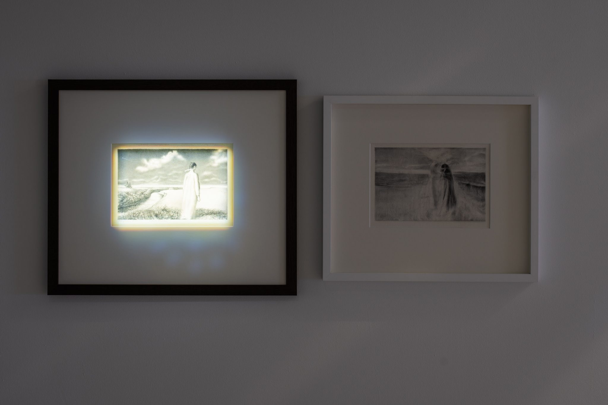 Rytis Valantinas, Thunder’s Distant Thunder, from a series of artworks created between 1974 and 2025, 2005. Mixed media, 38,9x30,1 cm; and Mykolas Valantinas, Thunder’s Distant Thunder, from a series of artworks created between 1974 and 2025, 1979. AI, mixed media, 46,9x33,5 cm. Photo by Lukas Mykolaitis