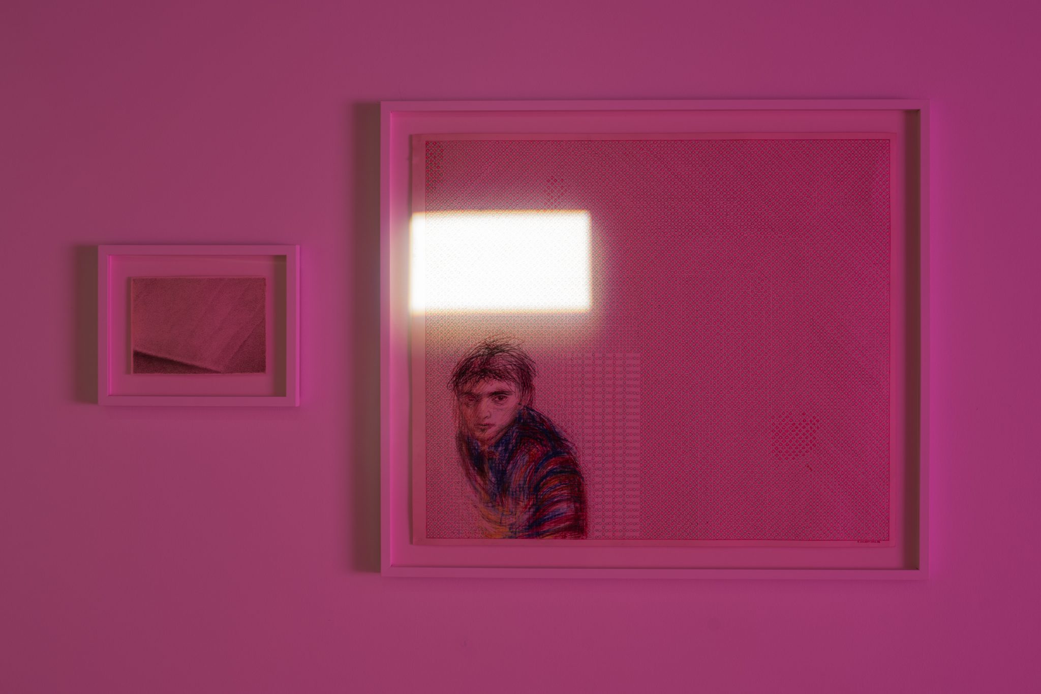 Rytis Valantinas, Untitled, from a series of artworks created between 1974 and 2025, 1992. Colored pen on paper, 79×69 cm; and Rytis Valantinas, Chapter Four, from a series of artworks created between 1974 and 2025, 1983. Colored pen on paper, 79×69 cm. Photo by Andrej Vasilenko