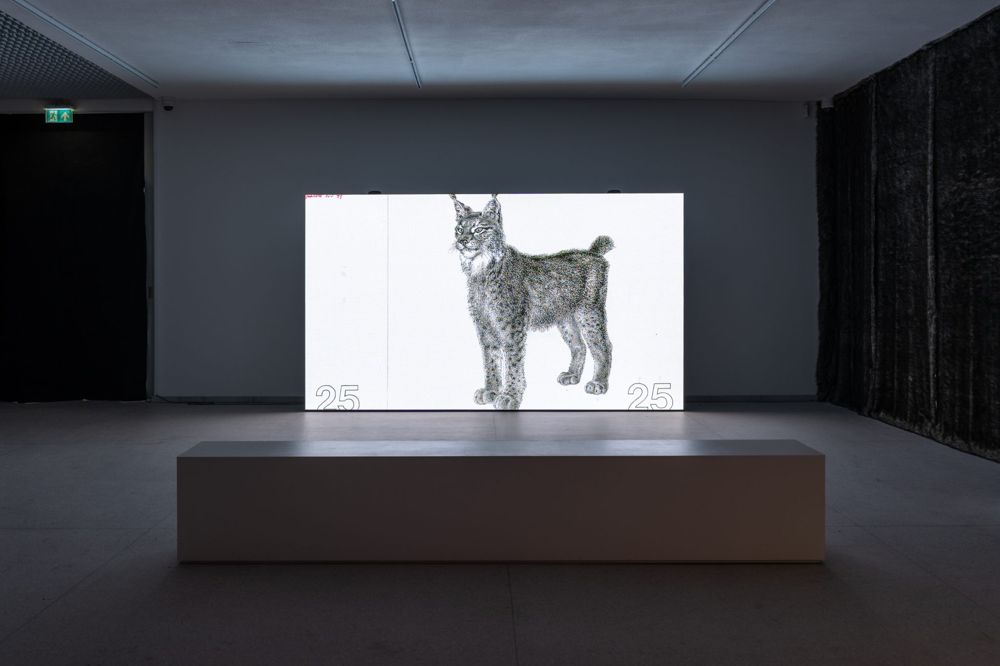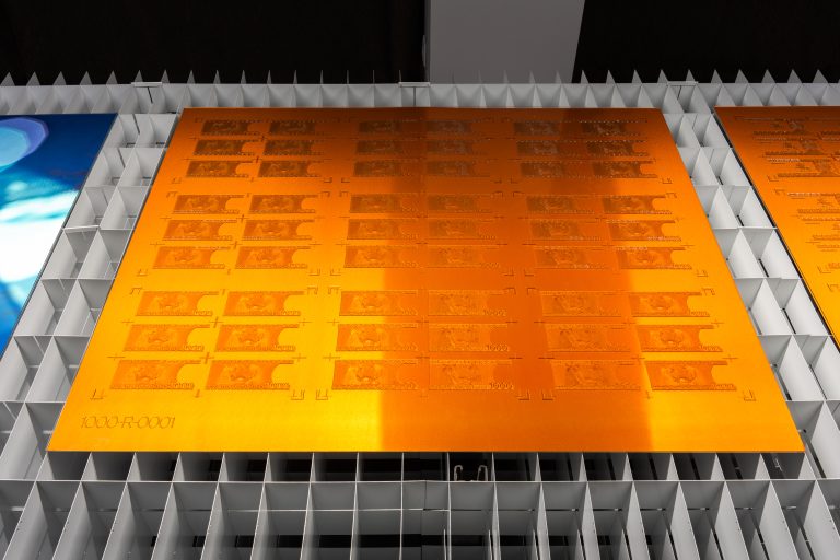 Mykolas Valantinas, 1K (Deconstructed Thousand), 2025. Photopolymer and offset printing plates, screen-printing frames with watermark and UV protection features, ECO3 Arziro Design+ security software, glass, table display