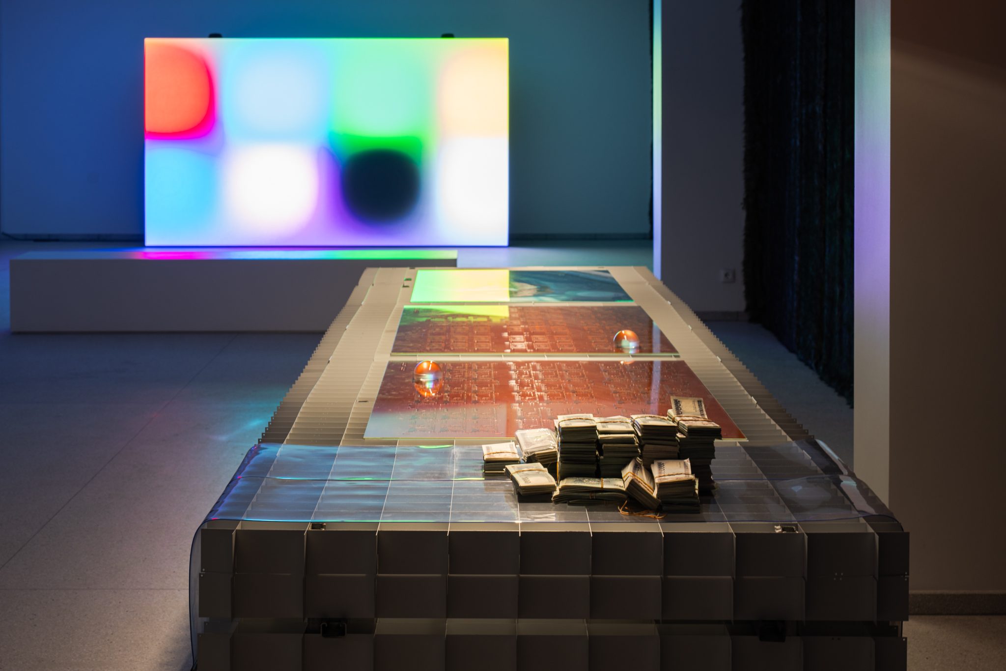 Mykolas Valantinas, 1K (Deconstructed Thousand), 2026. Photopolymer printing plates, ECO3 Arziro Design+ security software, 3.5 million Lithuanian litas in 1000 LTL banknotes (1991, first edition), glass, table display. Photo by Andrej Vasilenko