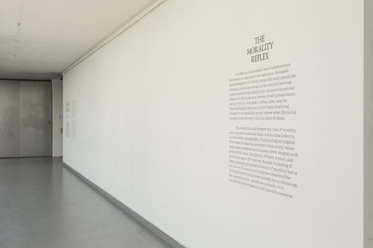 This exhibition addresses the idea of morality as a corporeal mode and aims to articulate links via an embedded cartography of psychological triggers. The research explores moments when moral values came under pressure and became newly shaped, such as the AIDS crisis, the history of birth control, and witch hunting in 15th century Europe. A reading of these instances proposes a history of morality that is not a story of continuous progress towards a free thinking, evenly distributed society, but a chronology that operates quite literally as a muscle, with contraction and relaxation over morality concerns. The exhibition proposes logics below the skin surface to grapple with a climate of fear, the collapse of state welfare, censorship and morality discourse both before and during capitalist acceleration.
