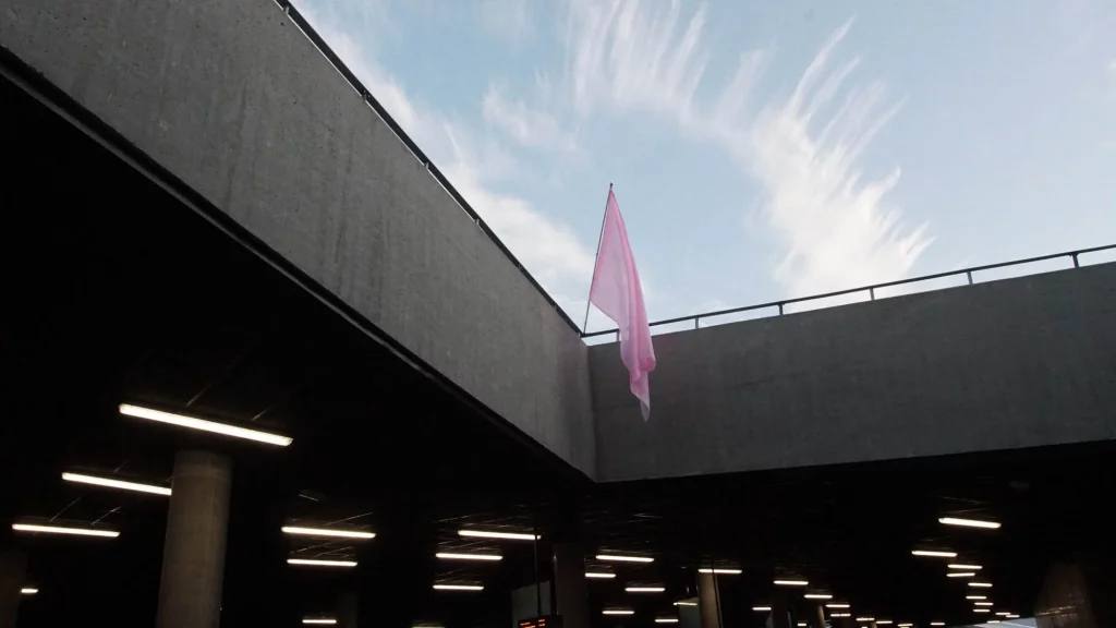The work Goodbye Gestures by artist and curator Vsevolod Kovalevskij, which invites reflection on the meaning of parting as a state between ending and renewal, was first commissioned in 2021 for the exhibition ‘To Live as a Mayfly’ in Tromsø, Norway. The piece comprised two identical 140 × 200 cm flags painted with cold beetroot soup, creating a shade the artist called ‘Baltic Pink’. One flag hung at the bus station, the other at the seaport, marking the trajectories of daily transit and departure.