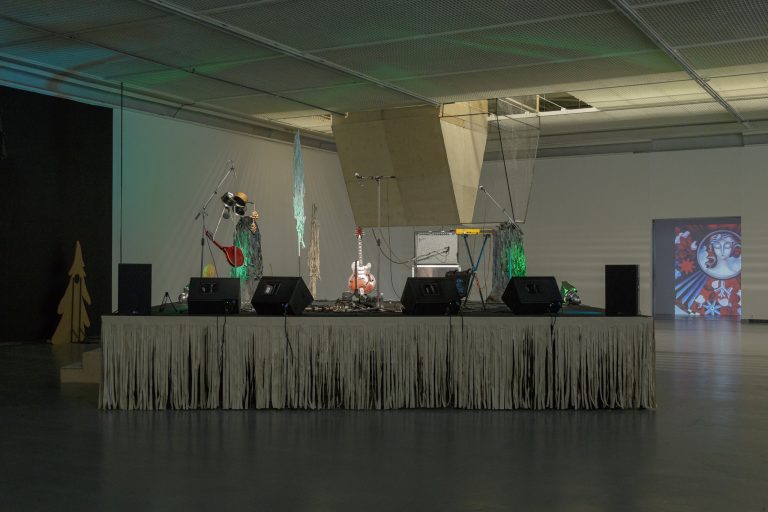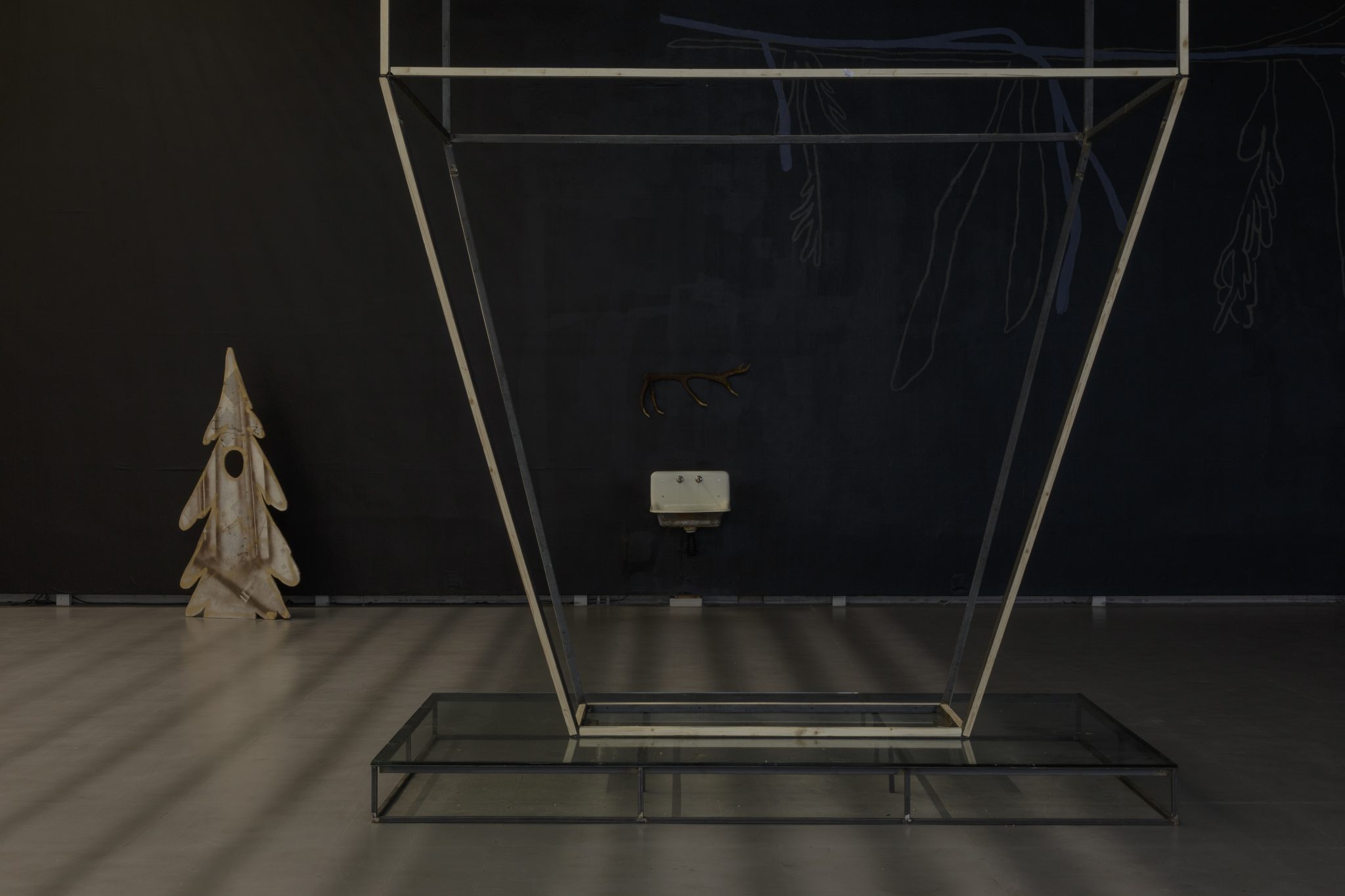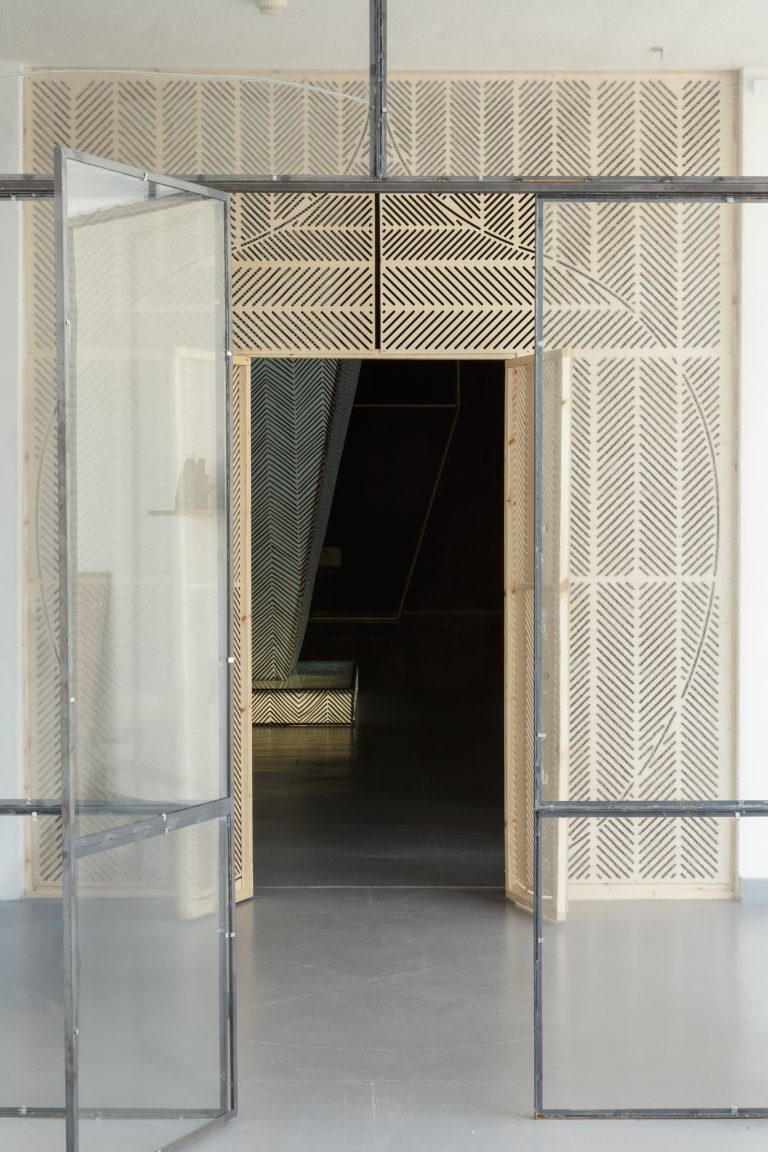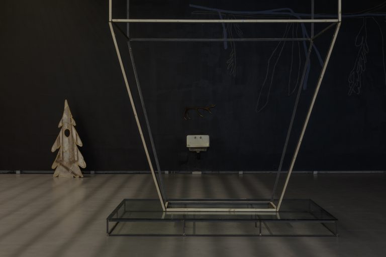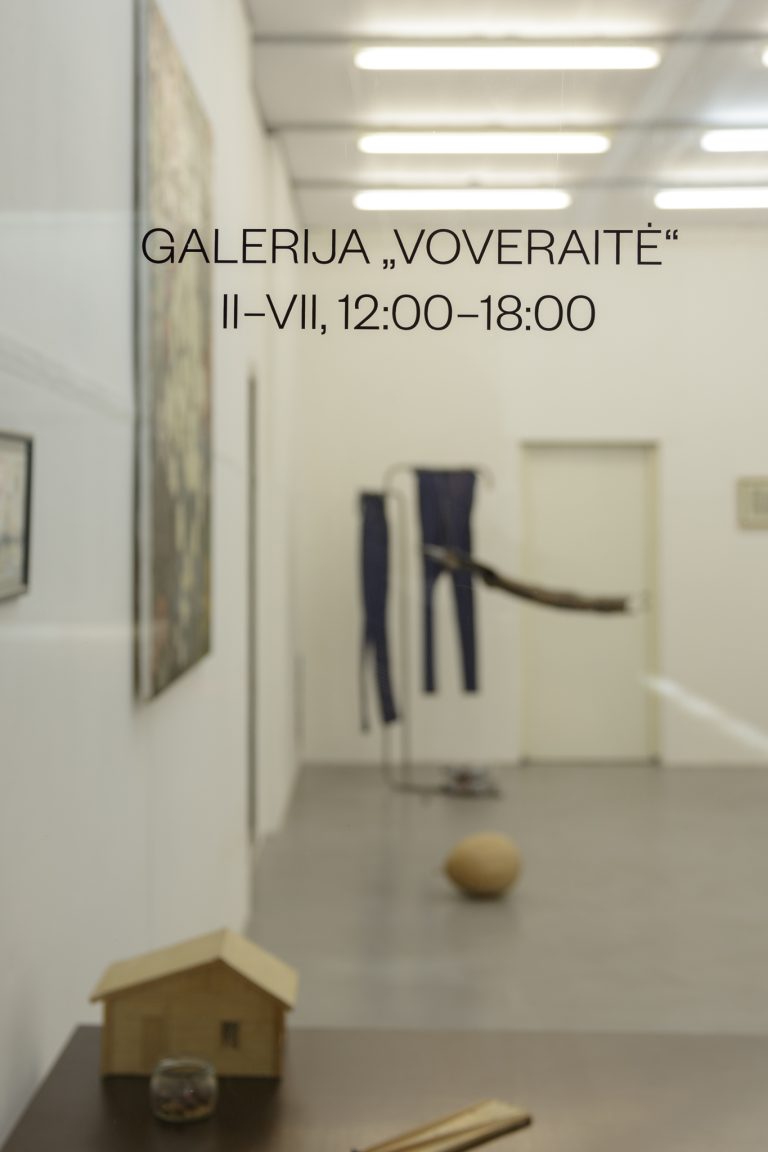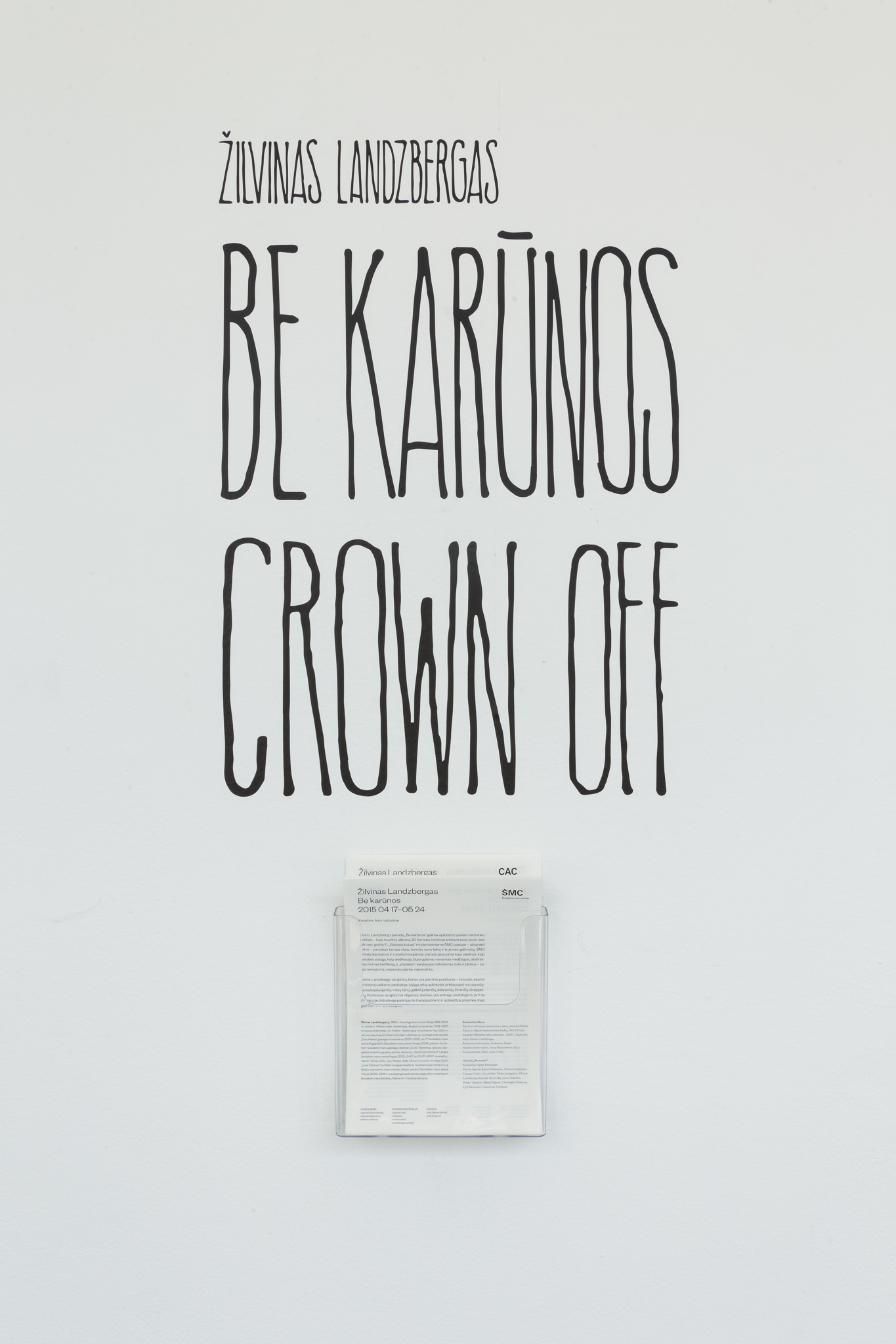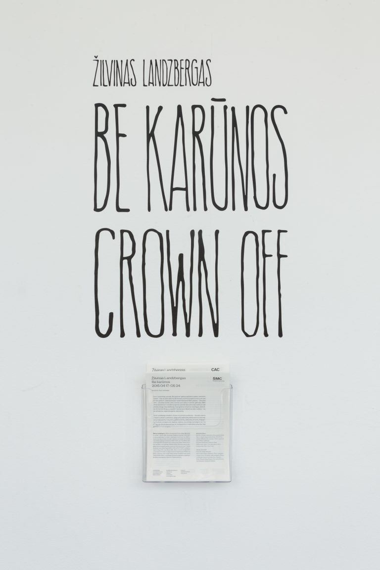 Žilvinas Landzbergas’ exhibition “Crown Off” could be introduced in the artist’s own words as a musical album in 3D (minimal ambient post-punk new folk neo-gothic?). In the exhibition, a “white cube” located within the modernist building of the CAC – an abstract space – becomes a place with its own time and possibility for duration. The CAC spaces are taken apart and transformed; the exhibition stretches through them as a drawing, as an appendix to reality, as a dedication. By knitting together apparent materials, abstract forms, and fiction, it draws onto reality and exposes its missing parts and cracks – that which is invisible, immeasurable, unnamed.