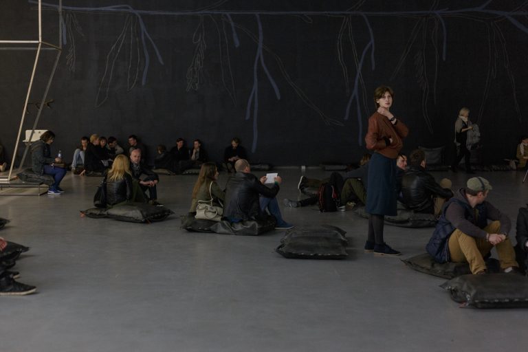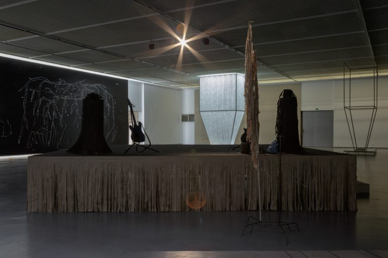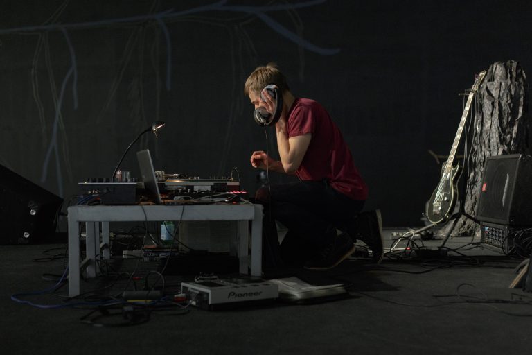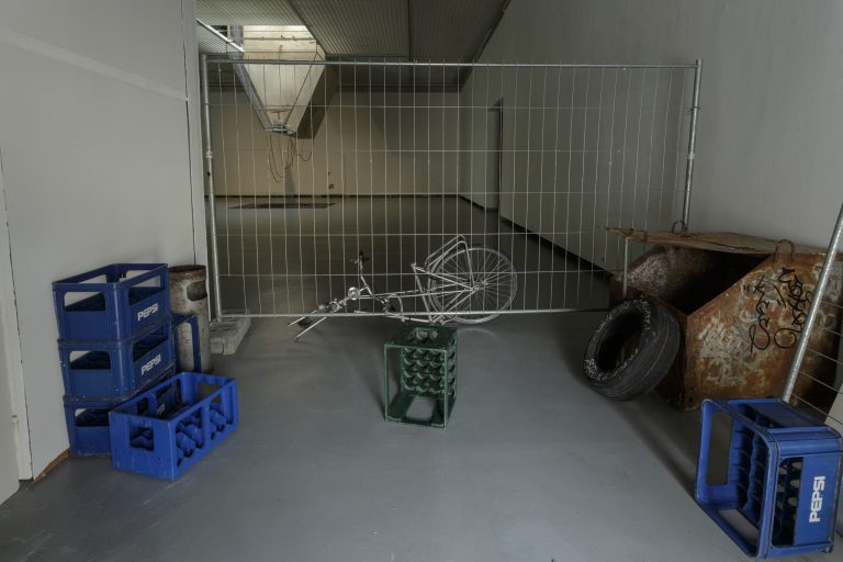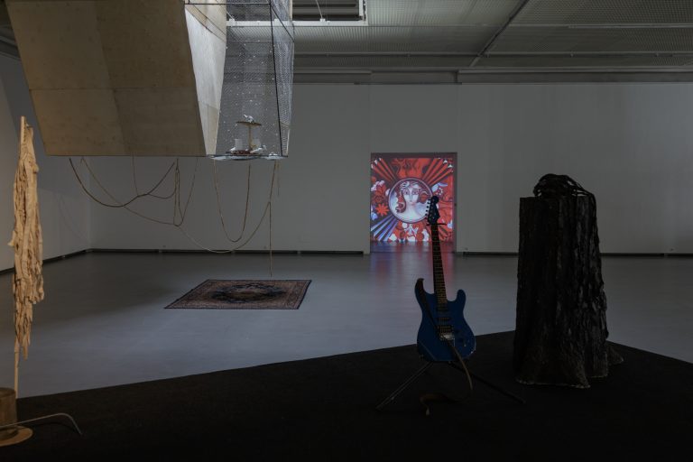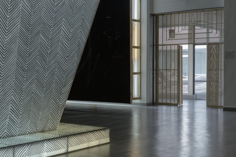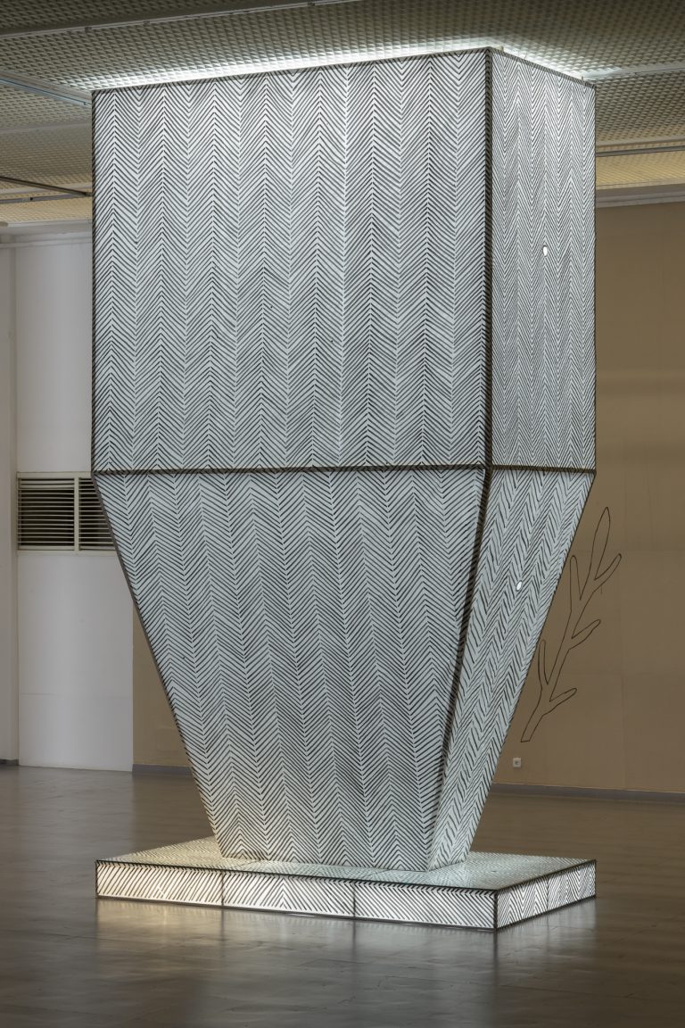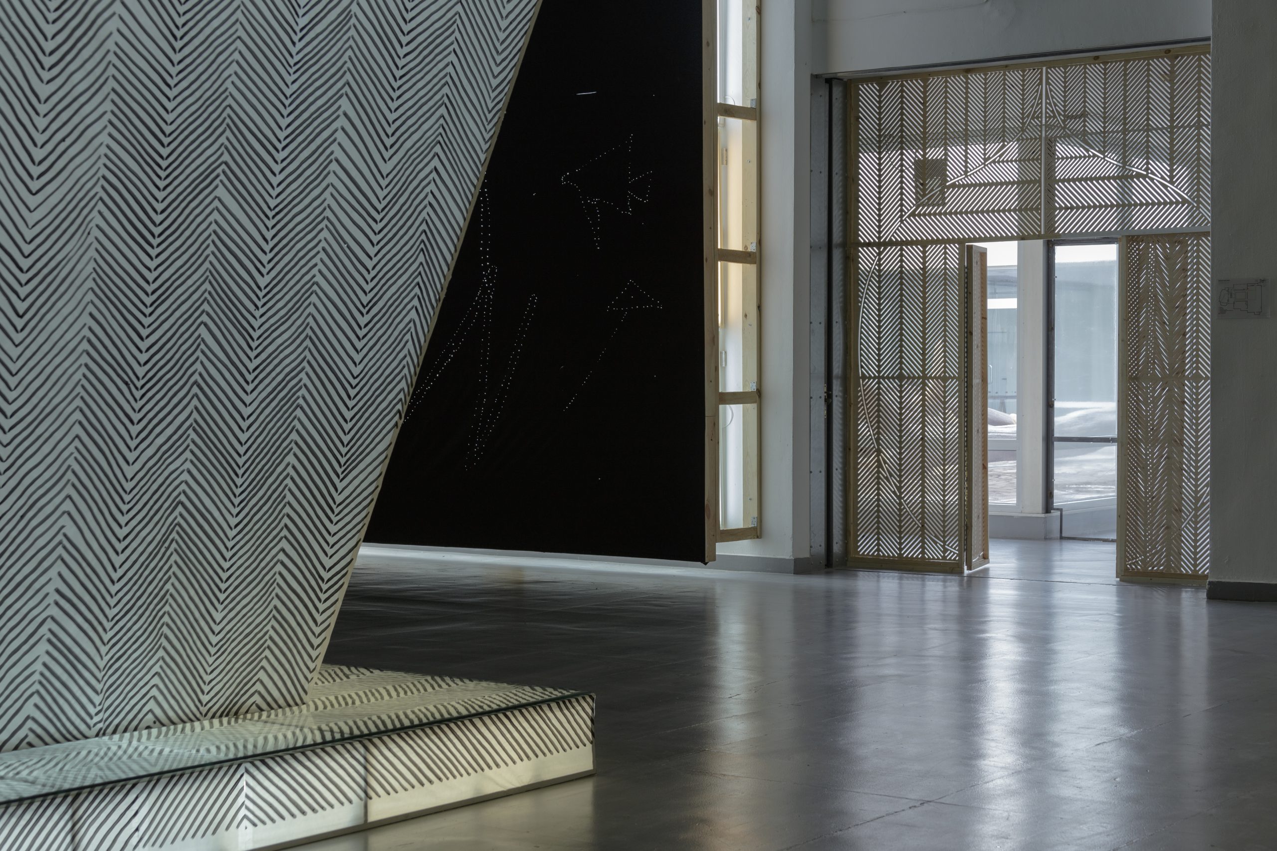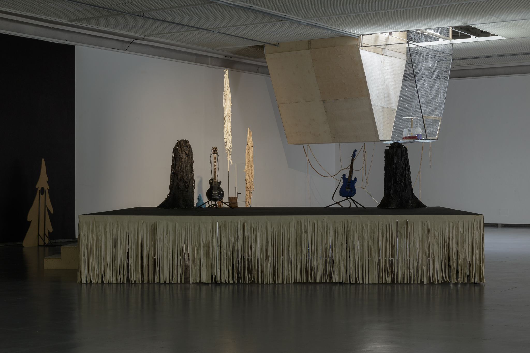 Žilvinas Landzbergas’ exhibition “Crown Off” could be introduced in the artist’s own words as a musical album in 3D (minimal ambient post-punk new folk neo-gothic?). In the exhibition, a “white cube” located within the modernist building of the CAC – an abstract space – becomes a place with its own time and possibility for duration. The CAC spaces are taken apart and transformed; the exhibition stretches through them as a drawing, as an appendix to reality, as a dedication. By knitting together apparent materials, abstract forms, and fiction, it draws onto reality and exposes its missing parts and cracks – that which is invisible, immeasurable, unnamed.