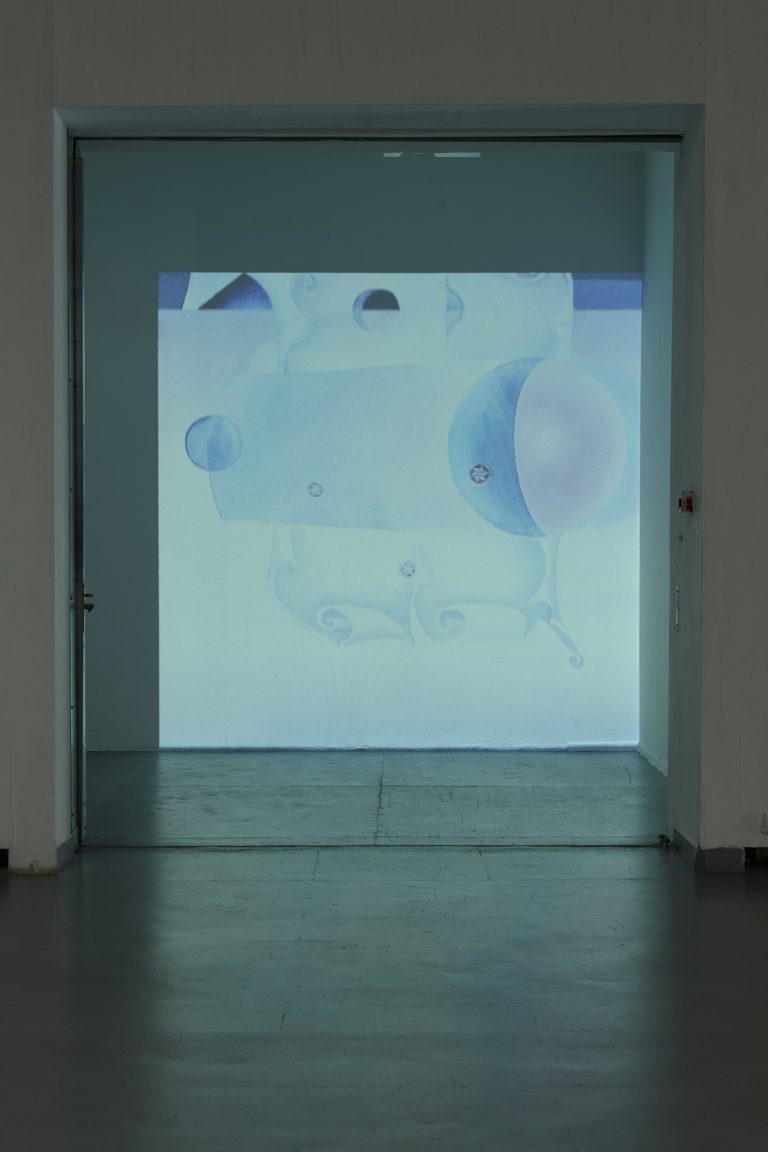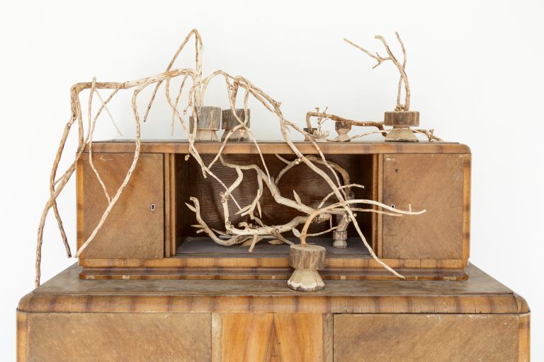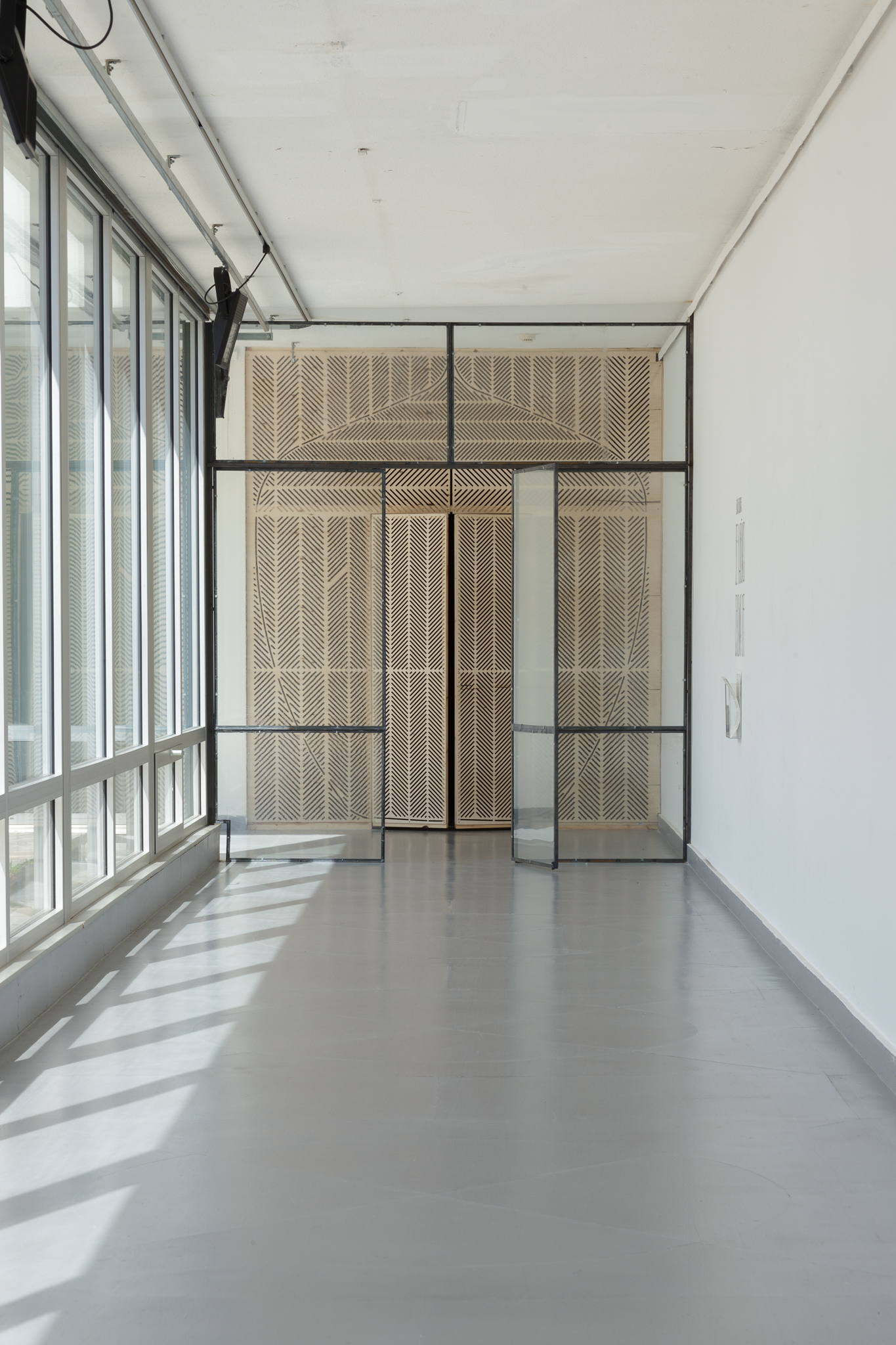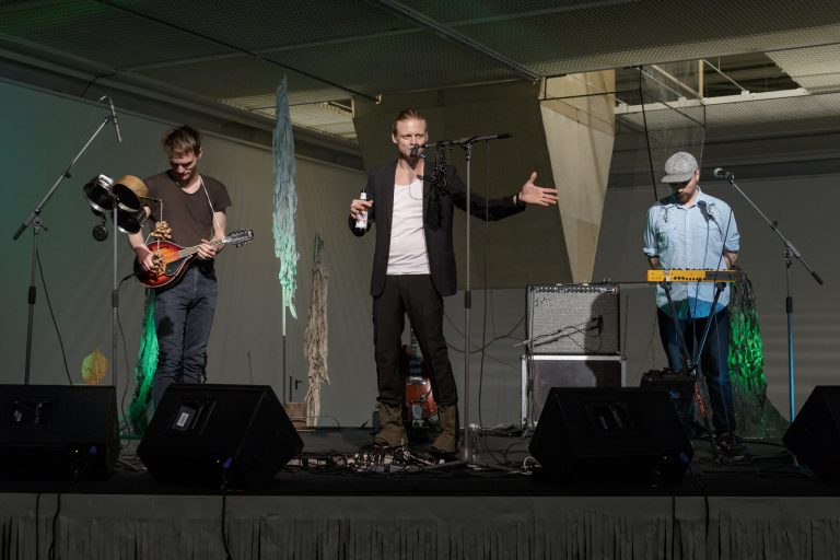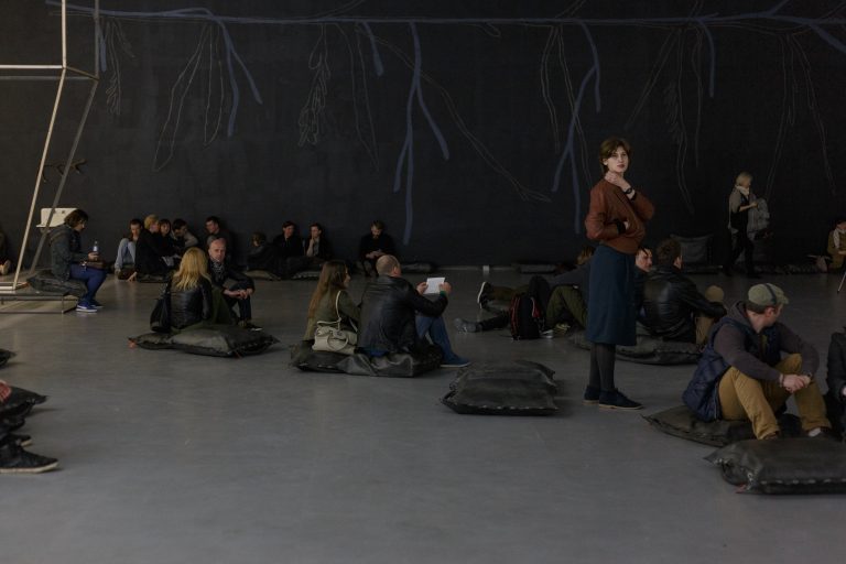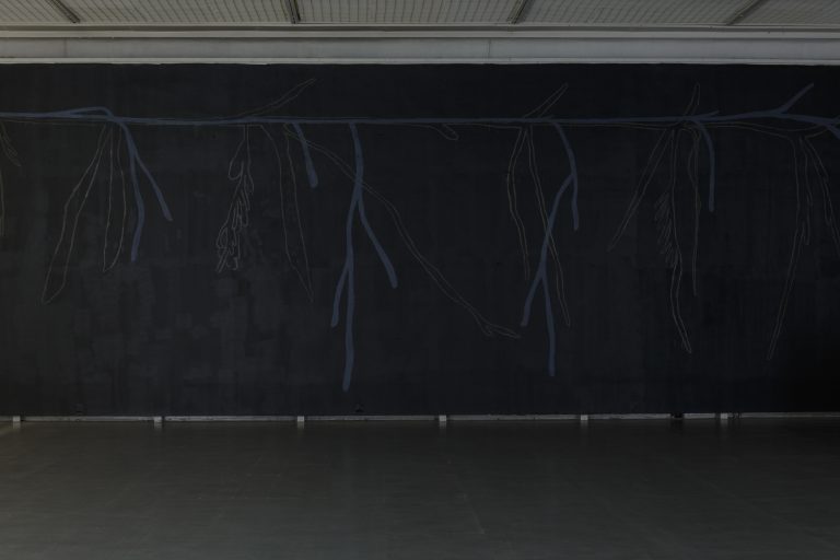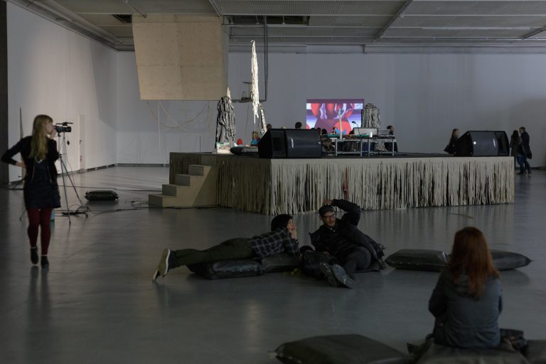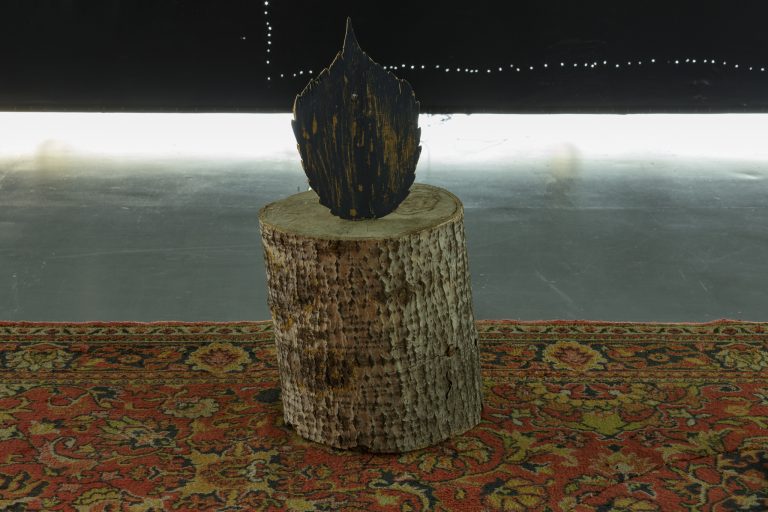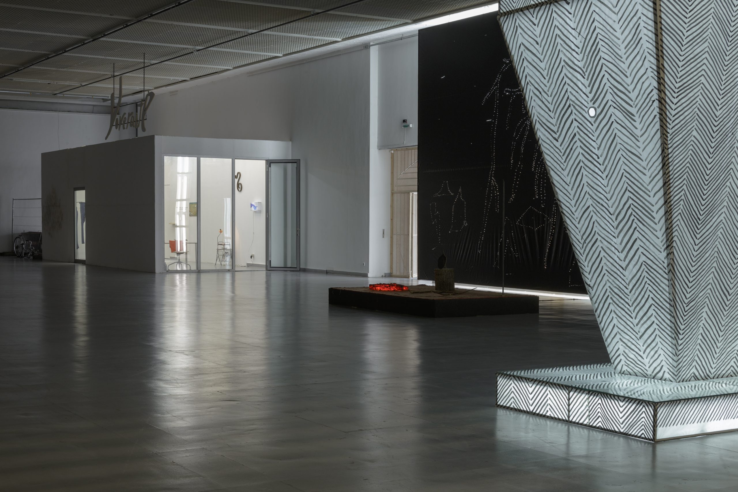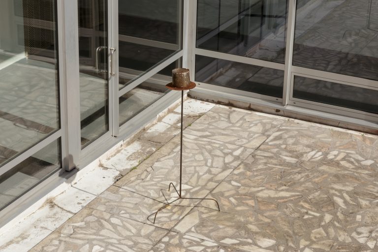 Žilvinas Landzbergas’ exhibition “Crown Off” could be introduced in the artist’s own words as a musical album in 3D (minimal ambient post-punk new folk neo-gothic?). In the exhibition, a “white cube” located within the modernist building of the CAC – an abstract space – becomes a place with its own time and possibility for duration. The CAC spaces are taken apart and transformed; the exhibition stretches through them as a drawing, as an appendix to reality, as a dedication. By knitting together apparent materials, abstract forms, and fiction, it draws onto reality and exposes its missing parts and cracks – that which is invisible, immeasurable, unnamed.