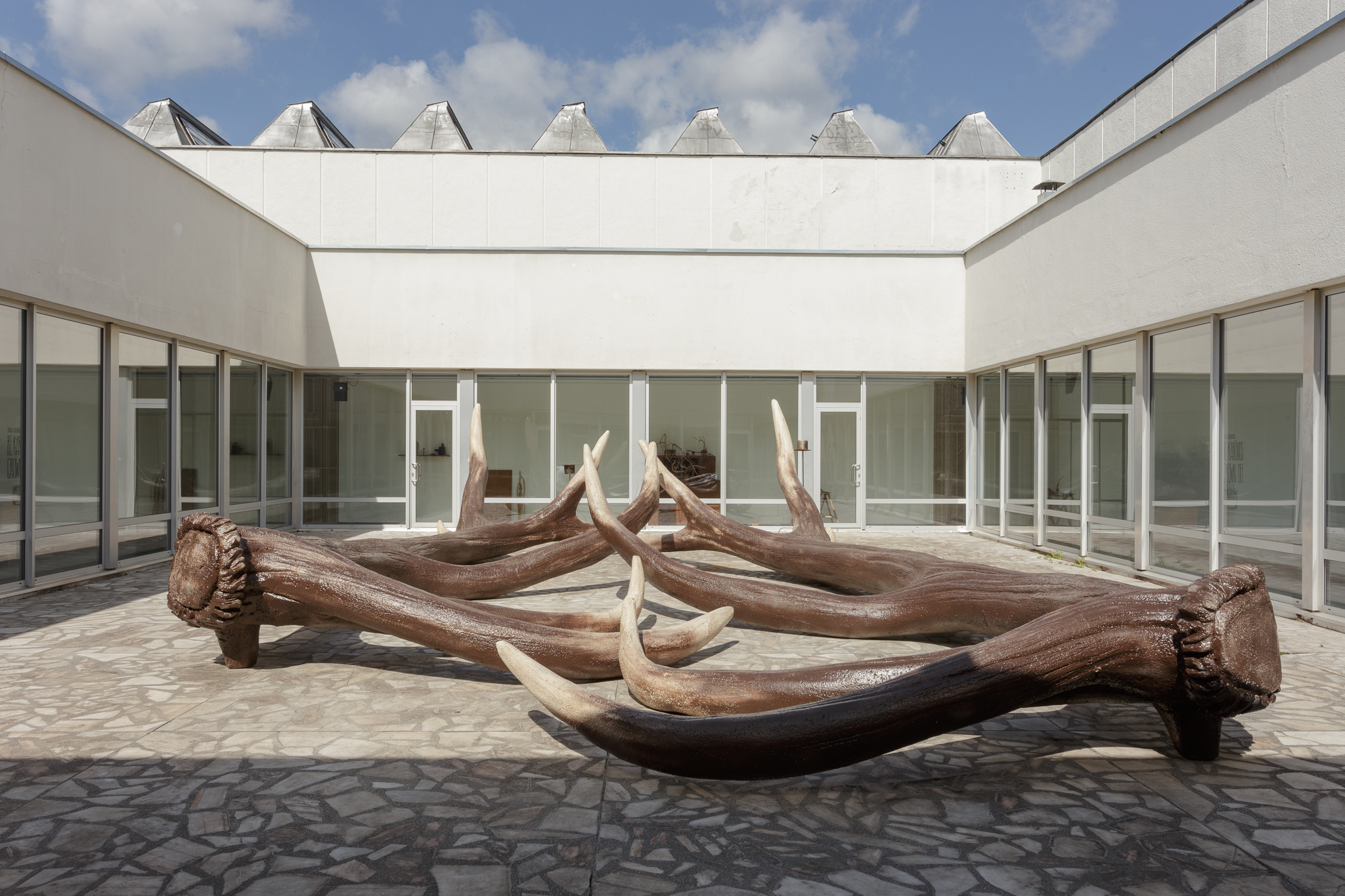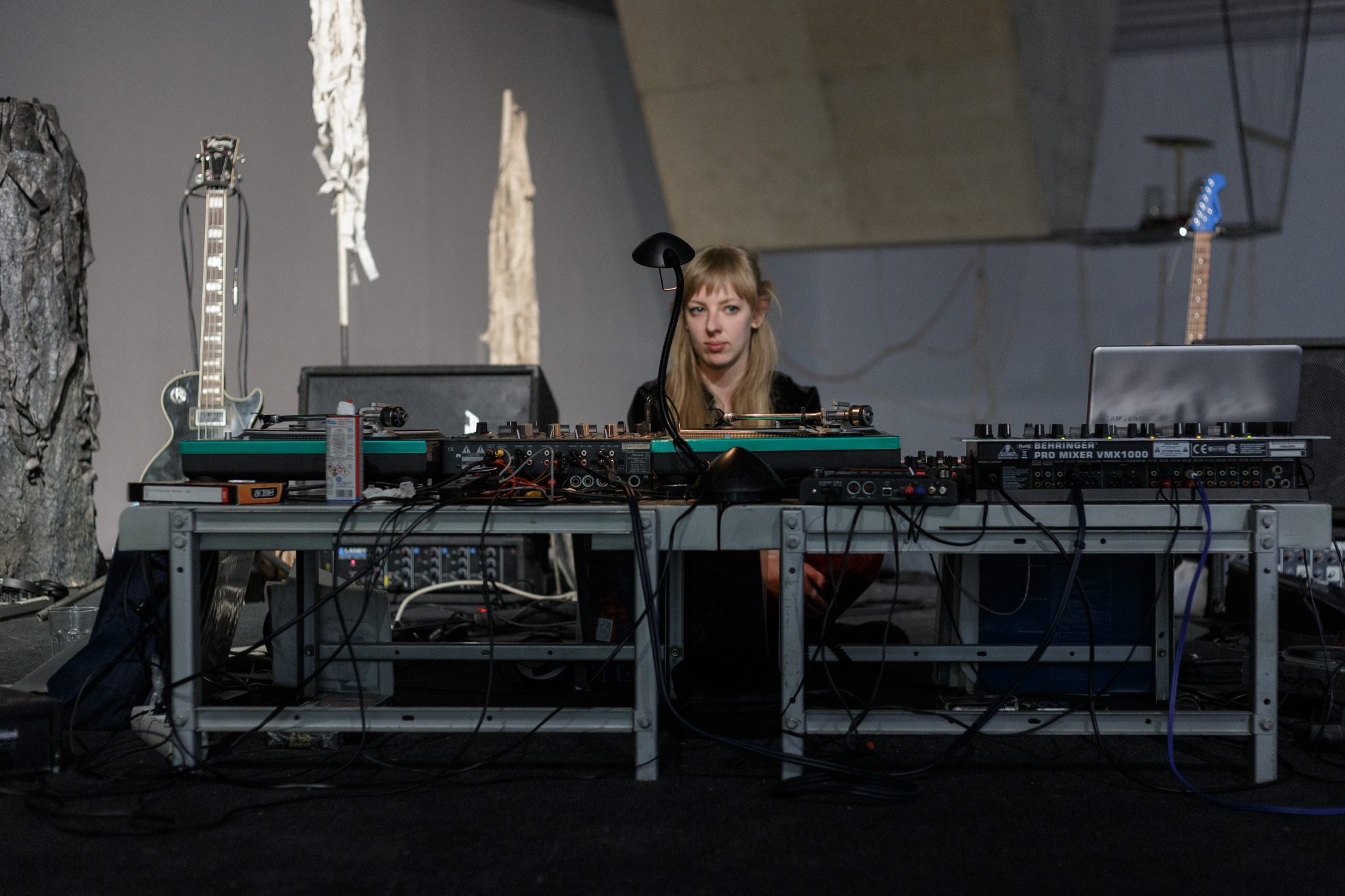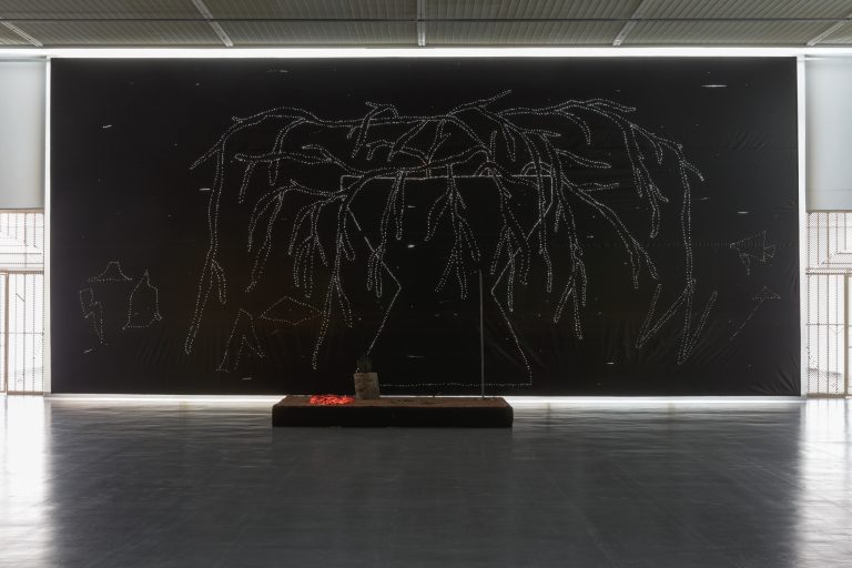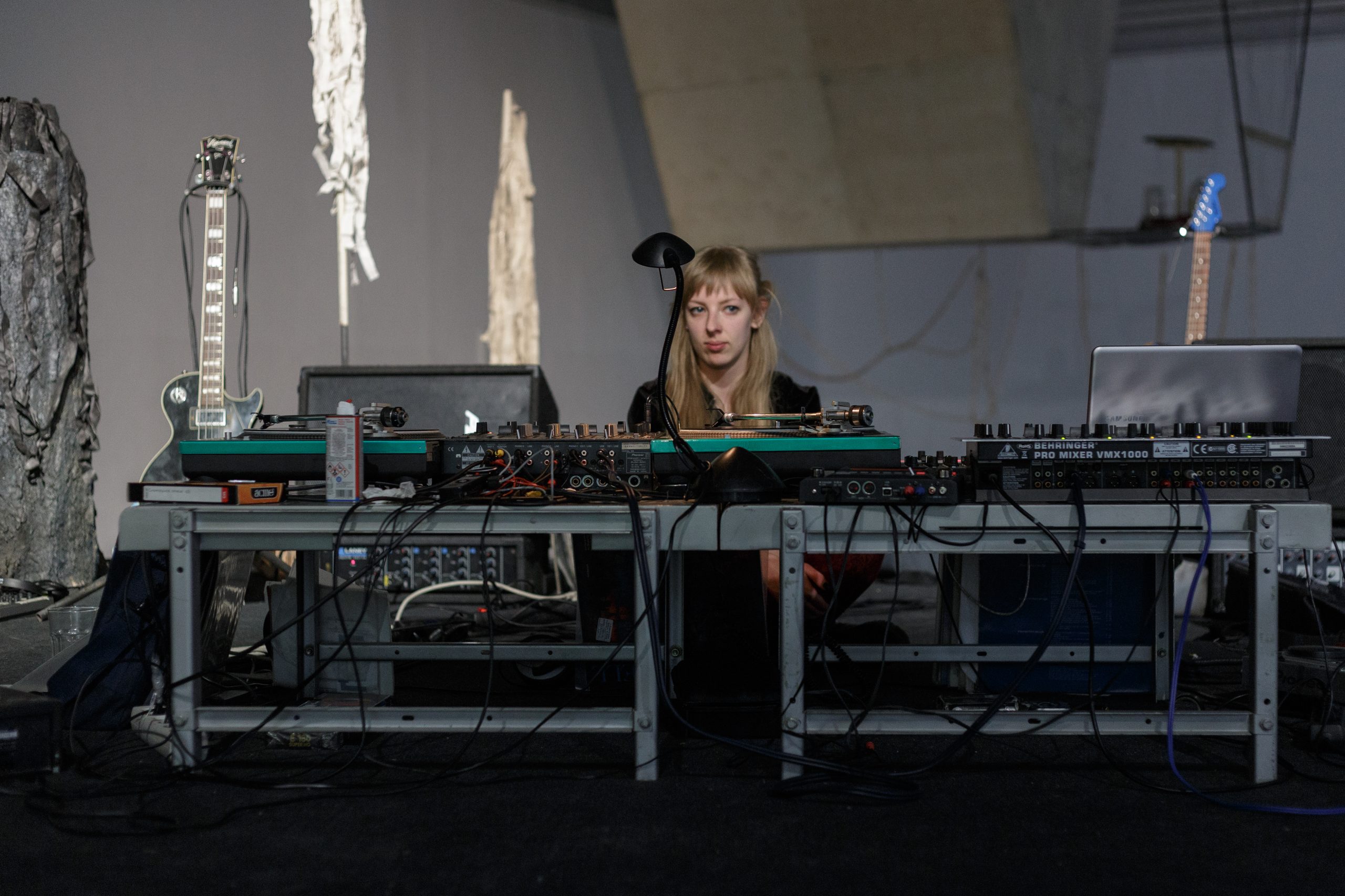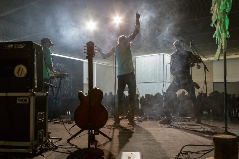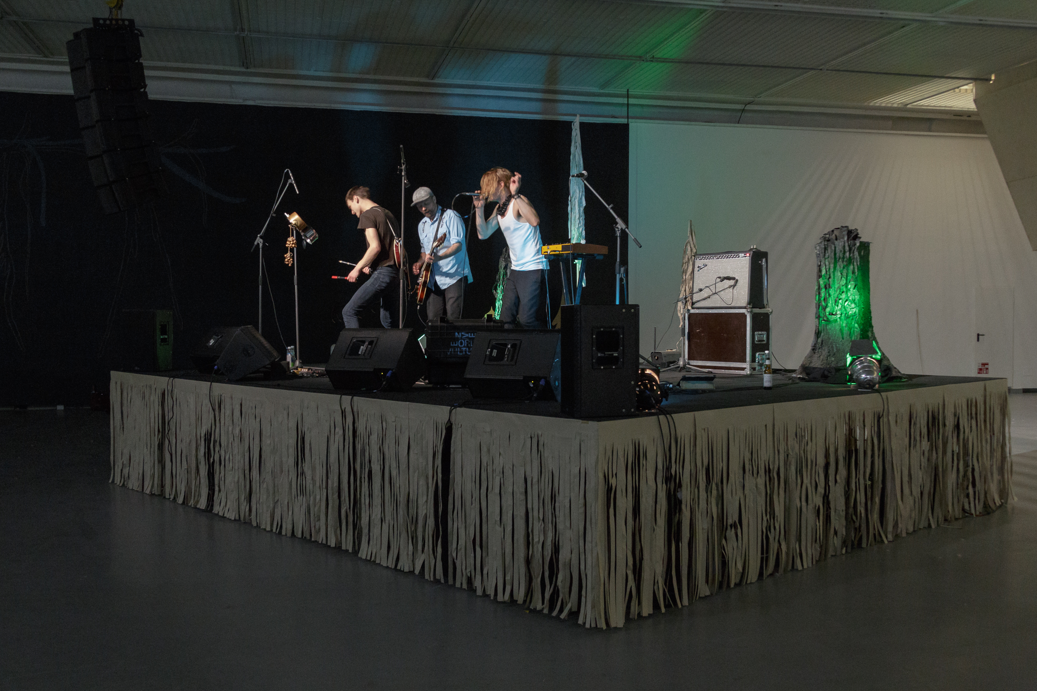 Žilvinas Landzbergas’ exhibition “Crown Off” could be introduced in the artist’s own words as a musical album in 3D (minimal ambient post-punk new folk neo-gothic?). In the exhibition, a “white cube” located within the modernist building of the CAC – an abstract space – becomes a place with its own time and possibility for duration. The CAC spaces are taken apart and transformed; the exhibition stretches through them as a drawing, as an appendix to reality, as a dedication. By knitting together apparent materials, abstract forms, and fiction, it draws onto reality and exposes its missing parts and cracks – that which is invisible, immeasurable, unnamed.