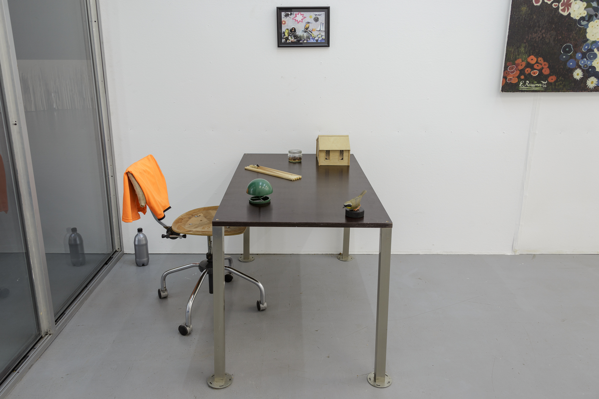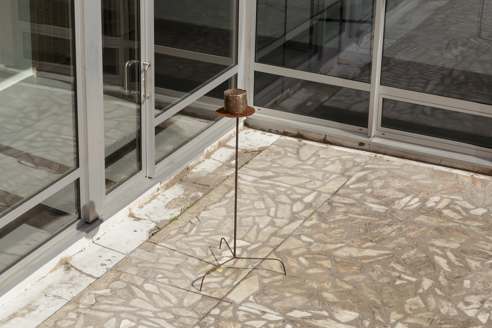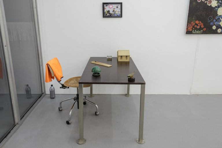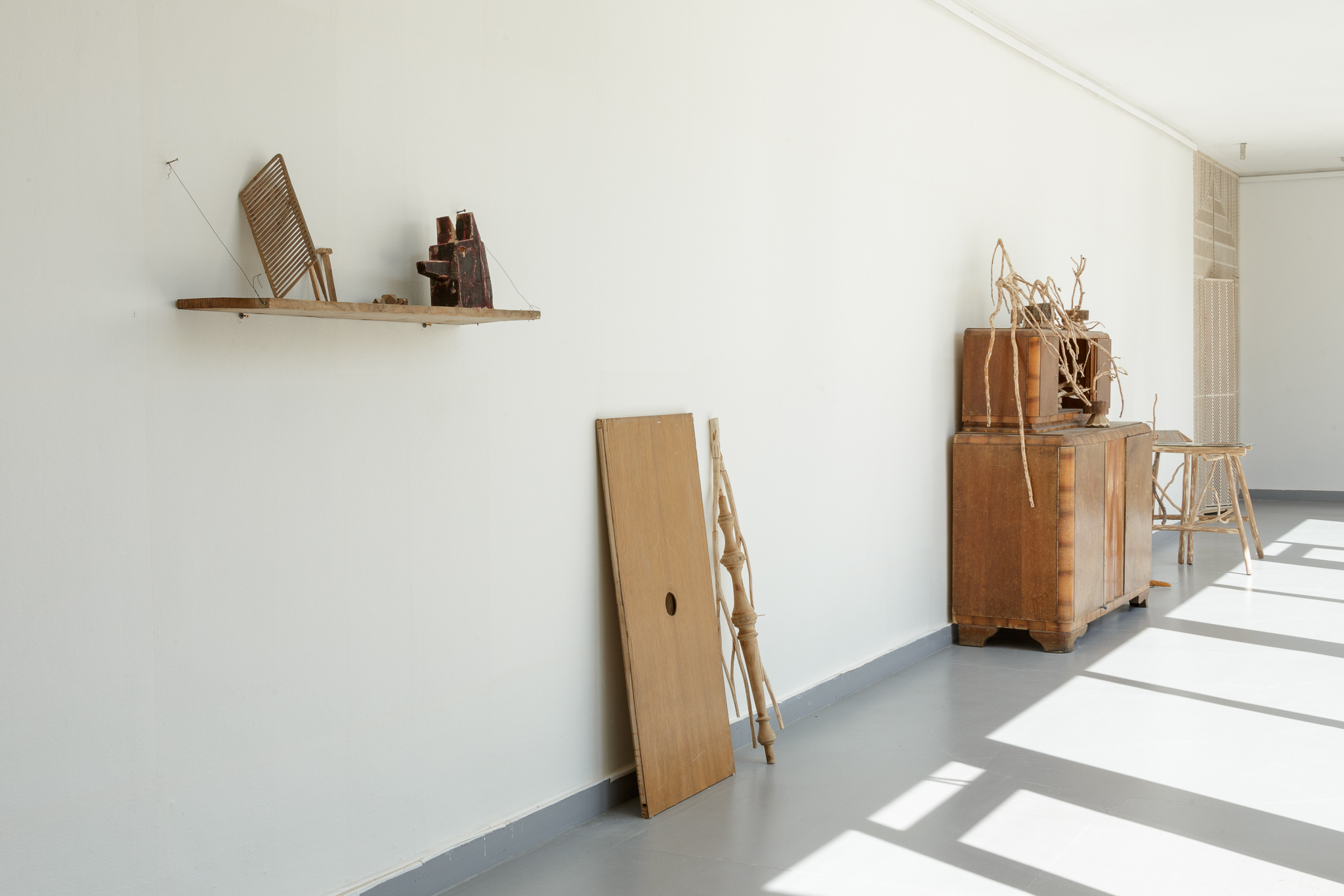 The physical body of Landzbergas’ sculptures is initially a dotted line; it is a trace, a condition, or a circumstance of a past, present, or future event. This phenomenon is subject to our own exhibition/sound-copying bodies that perhaps move, linger, perceive or hesitate. A particular sculptural object, a thing, exists in a space and in relation to it and to us in it; residing in the pre-verbal experience, before (mis)recognition and definite meaning. As in nature: 1+1=3 and more.