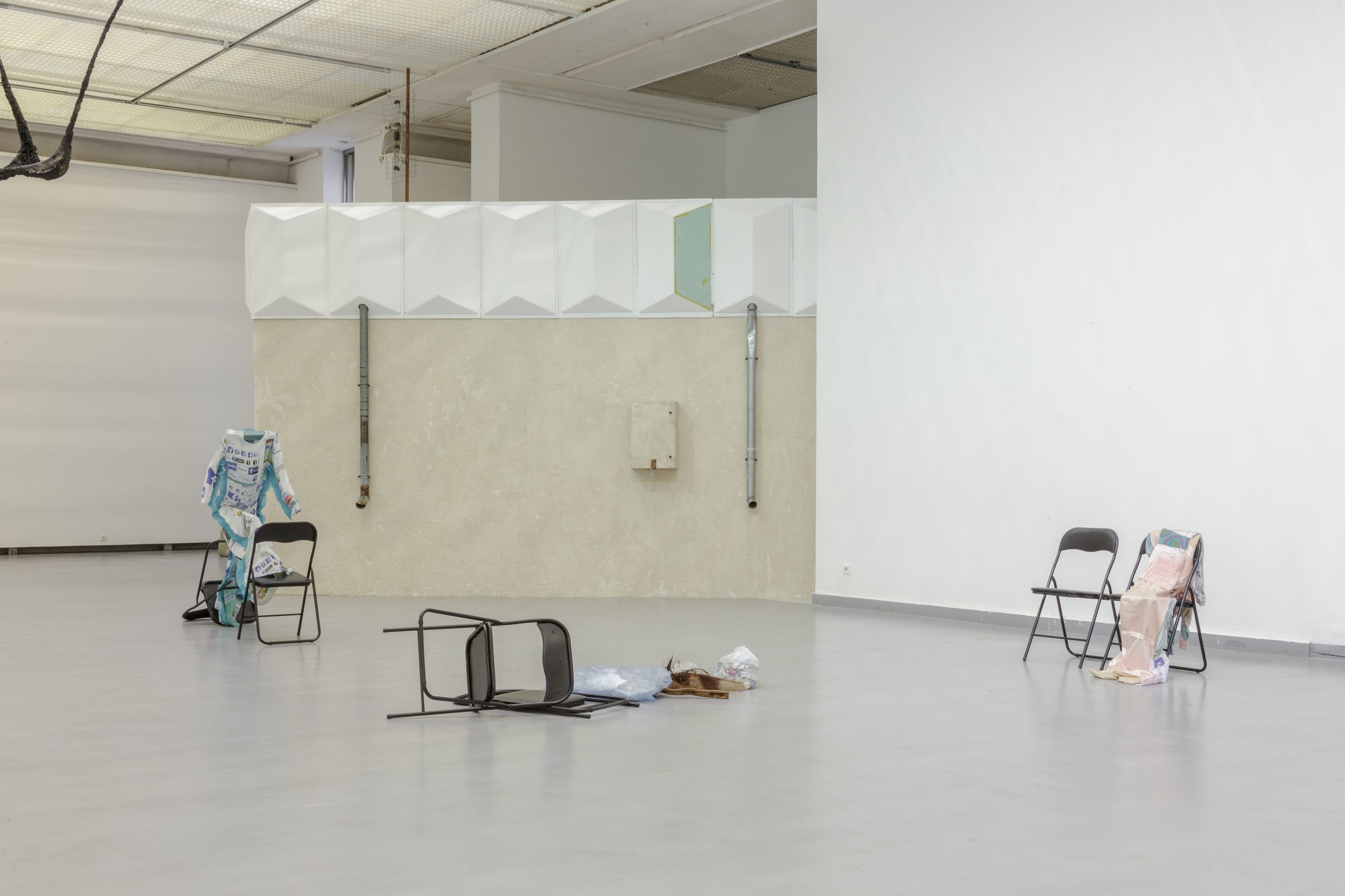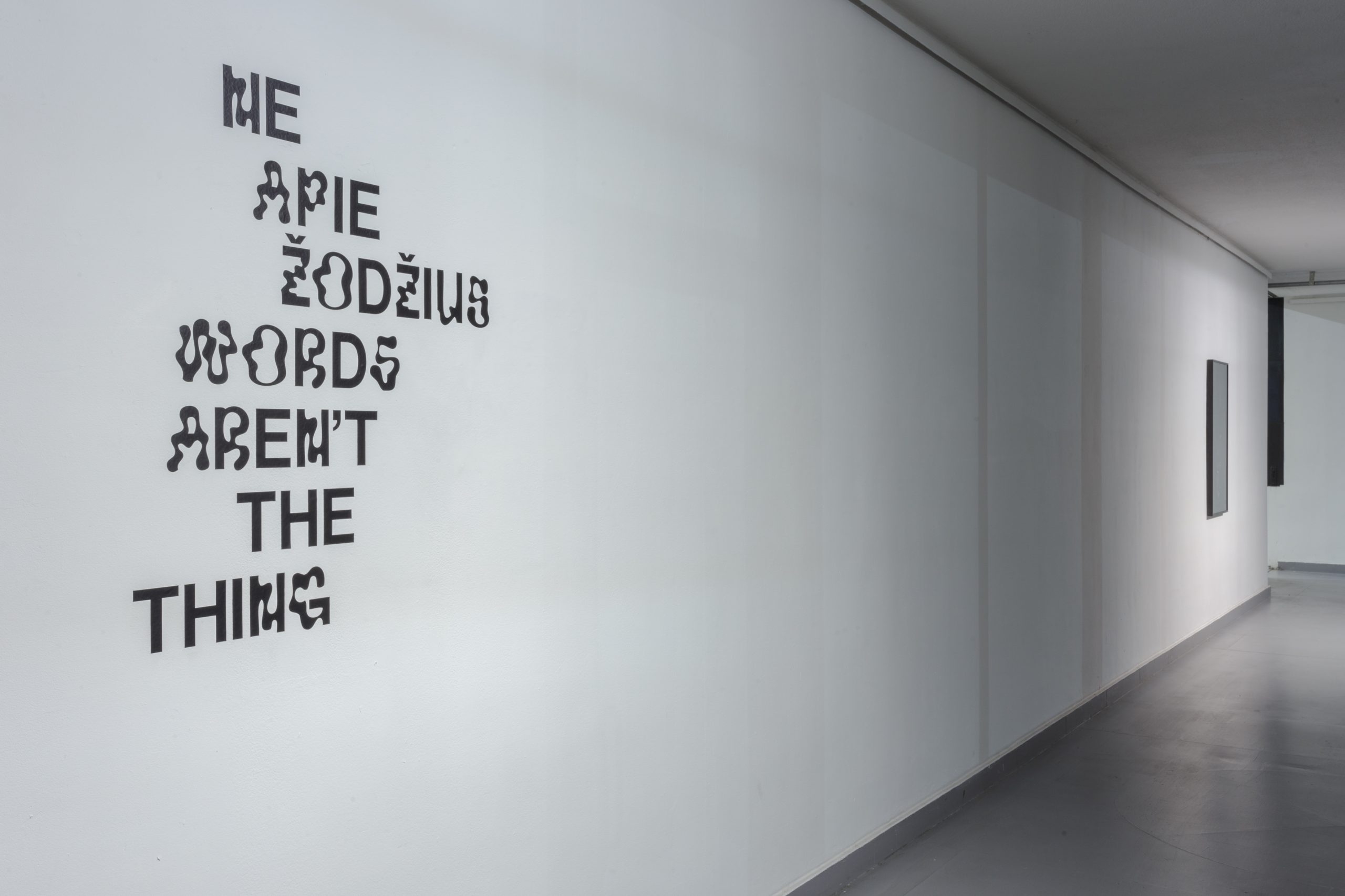 Prasidėjusi ten, kur baigiasi žodžiai, paroda „Ne apie žodžius“ atsiveria instinktyvumui, materijai, vizualumui ir subjektyviam santykiui. Ji pasirodo kaip vientisas, tačiau įvairialypis kūnas – miražiškas gamtovaizdis, lyg dekoracija ar medžiotojo jaukas, viliojantis akį ir atveriantis tik dalelę visumos. Parodos kūriniuose jungiasi materija ir patirtis, susipina ironija ir nuoširdumas, maskuotė ir groteskas, vaidyba ir laimingi atsitiktinumai. Kūriniai kviečia susitikti pusiaukelėje, drauge likdami tvirtai įaugę daiktų pasaulyje – pažiniame per santykius, kuriems įvardinti, laimei, nebeužtenka žodžių.